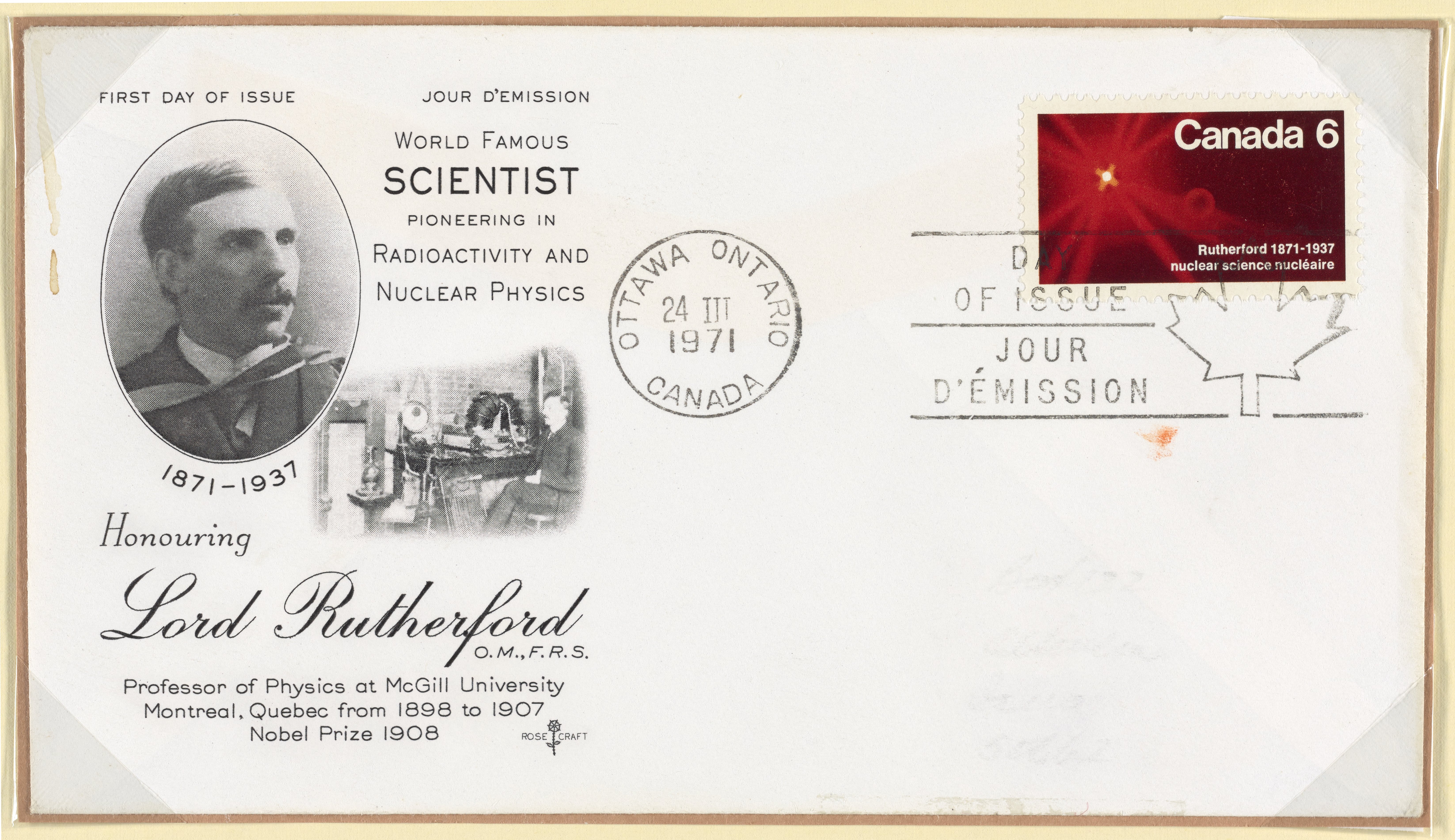 Ray Webber. “First Day Cover Honoring Ernest Rutherford.” Canada, 1971. Witco Stamp Collection, Box 2. Science History Institute. Philadelphia. https://digital.sciencehistory.org/works/g732d9021.