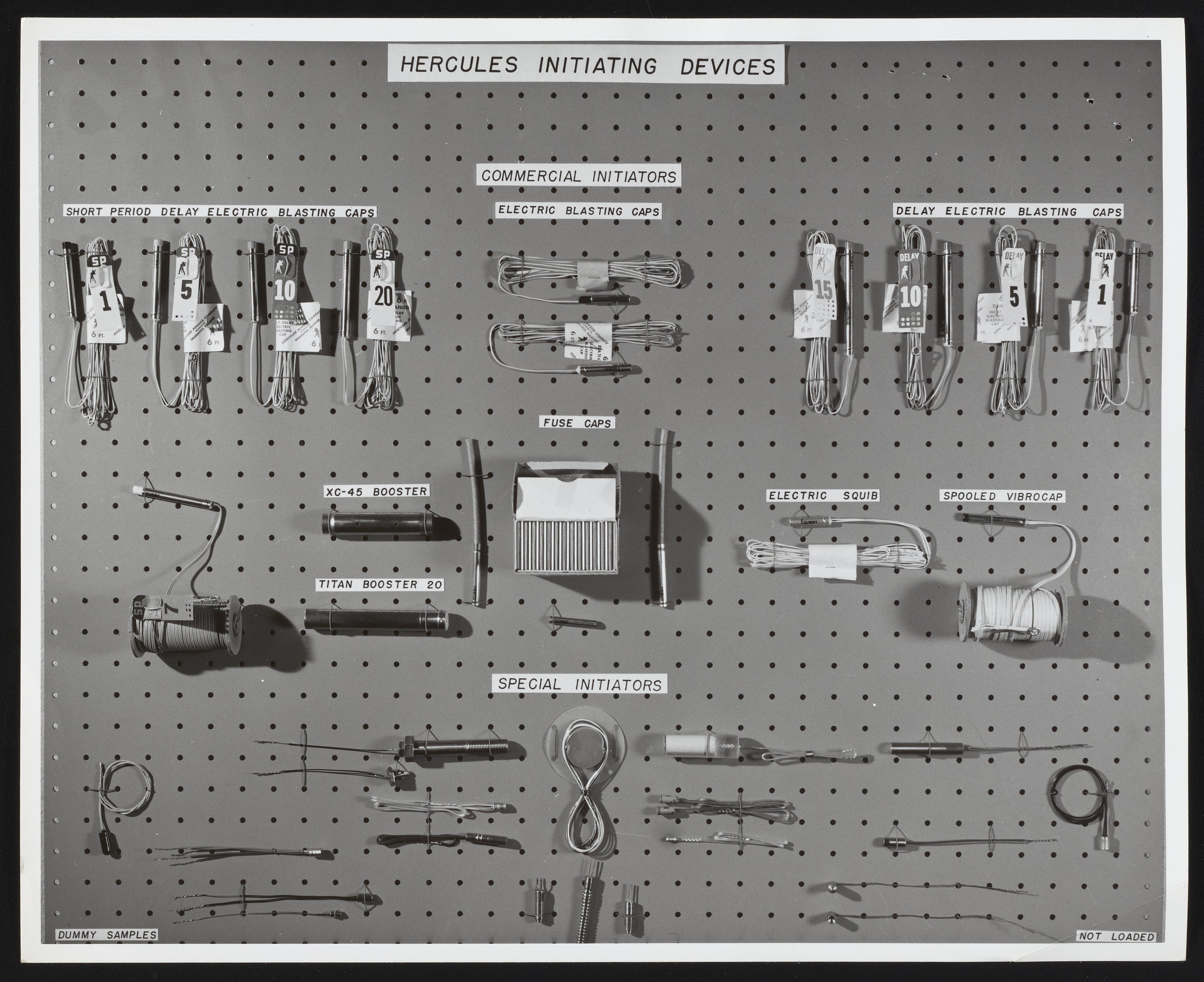 General view of a display featuring dummy samples of a range of detonation-initiating devices manufactured at the Hercules Powder Company plant in Port Ewen, New York. Products visible on the display board include electric blasting caps, an electric squib, spooled vibrocap, and a variety of special initiators.
