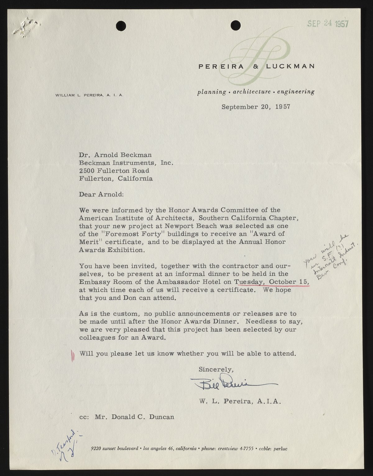 Letter from W. L. Pereira to Arnold O. Beckman