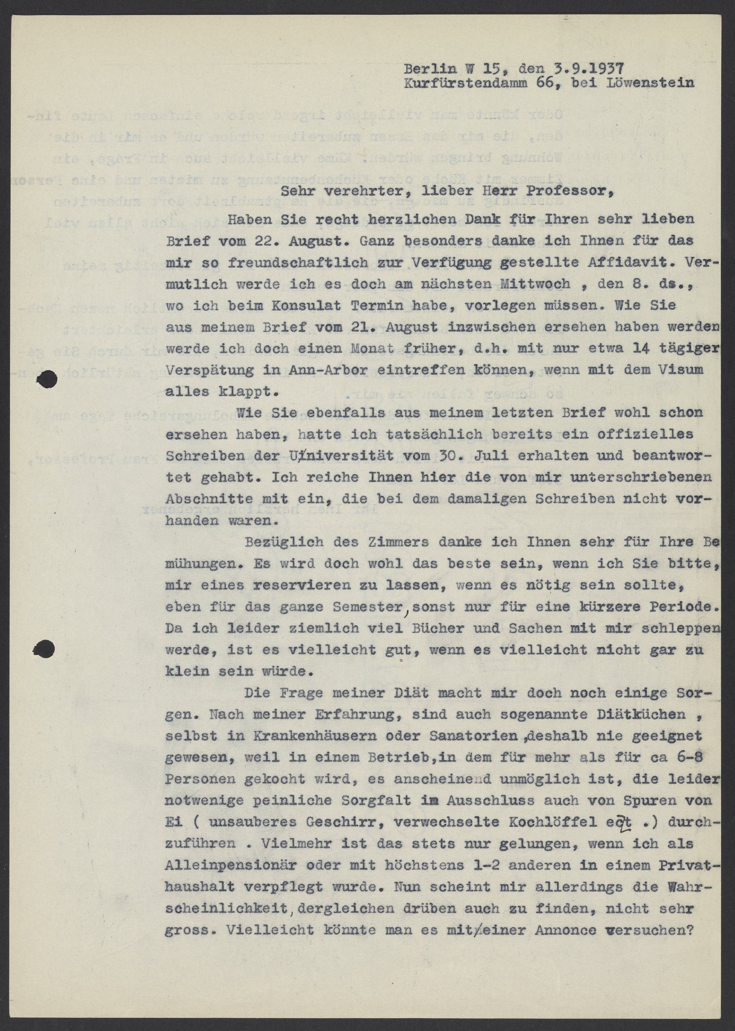 Letter from Max Bredig to Kasimir Fajans, September 3, 1937