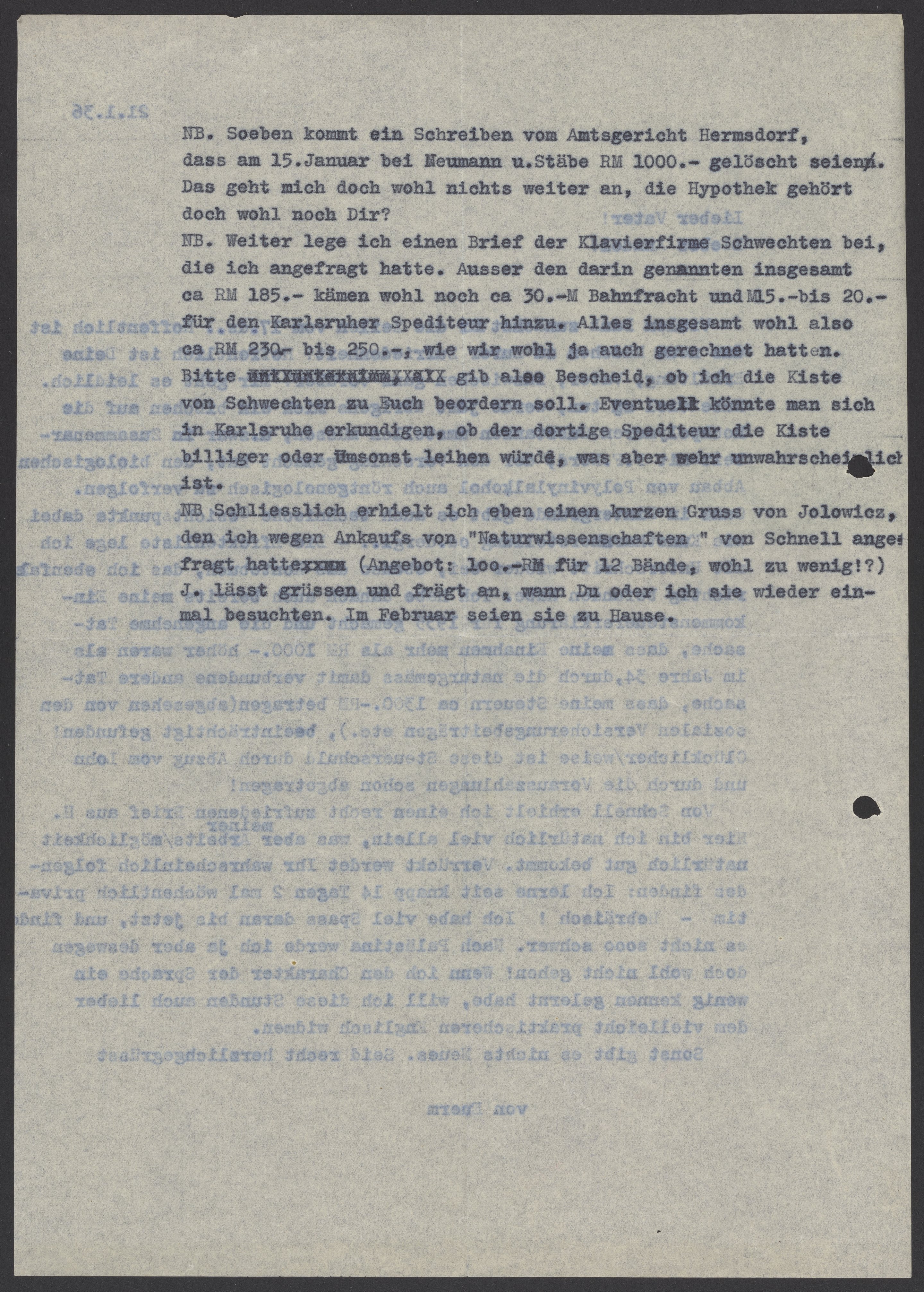 NB. Weiter lege ich einen Brief der Klavierfirma Schwechten bei, die ich angefragt hatte. Ausser den darin genannten insgesamt RM 185.- kämen wohl noch ca. 30.-M Bahnfracht und M5.- bis 20.- für den Karlsruher Spediteur hinzu. Alles insgesamt wohl also ca RM 230.- bis 250.-, wie wir wohl ja auch gerechnet hatten. Bitte, gib also Bescheid, ob ich die Kiste zu Euch beordern soll. Eventuell könnte man sich in Karlsruhe erkundigen, ob der dortige Spediteur die Kiste billiger oder umsonst leihen würde, was aber mehr unwahrscheinlich ist.