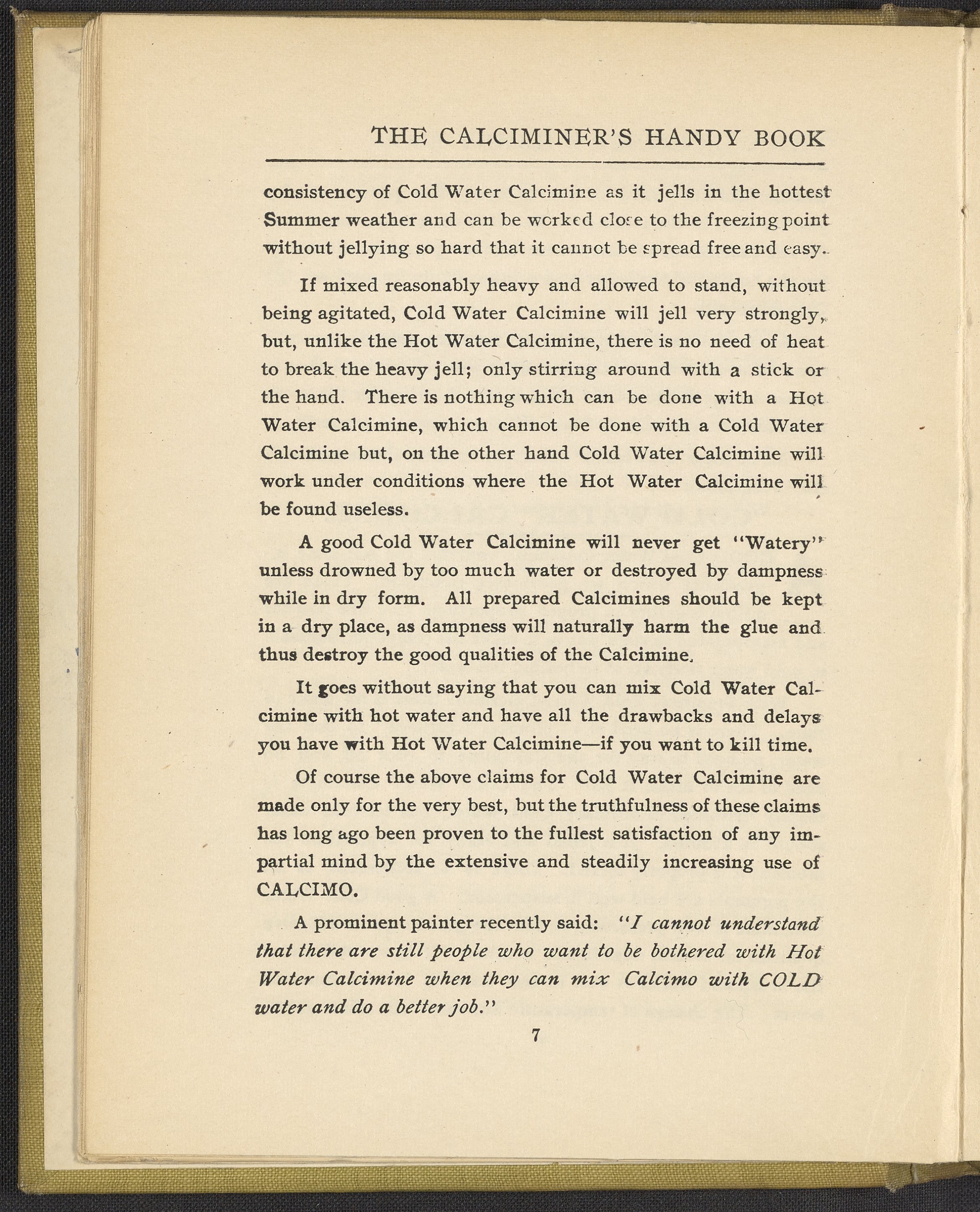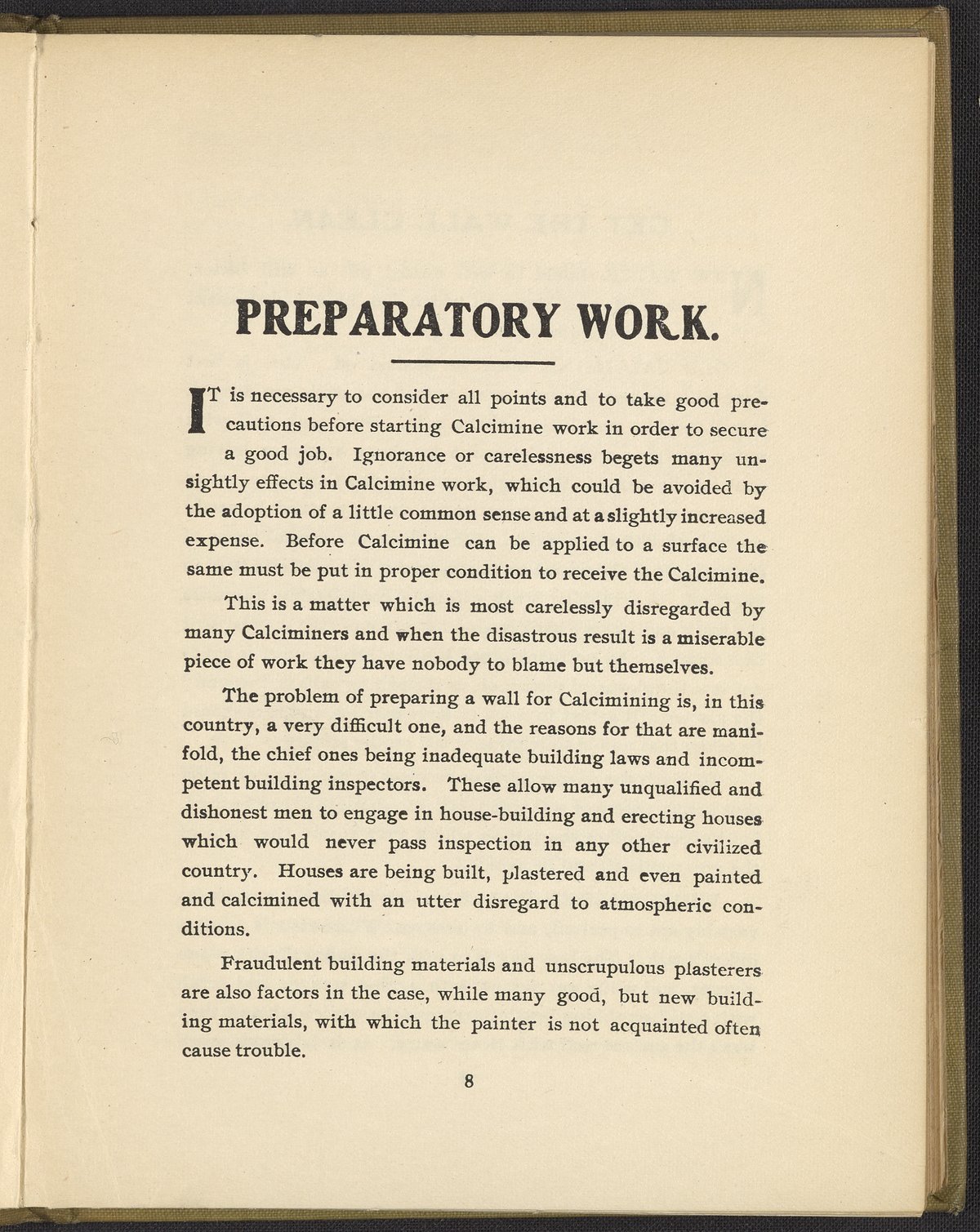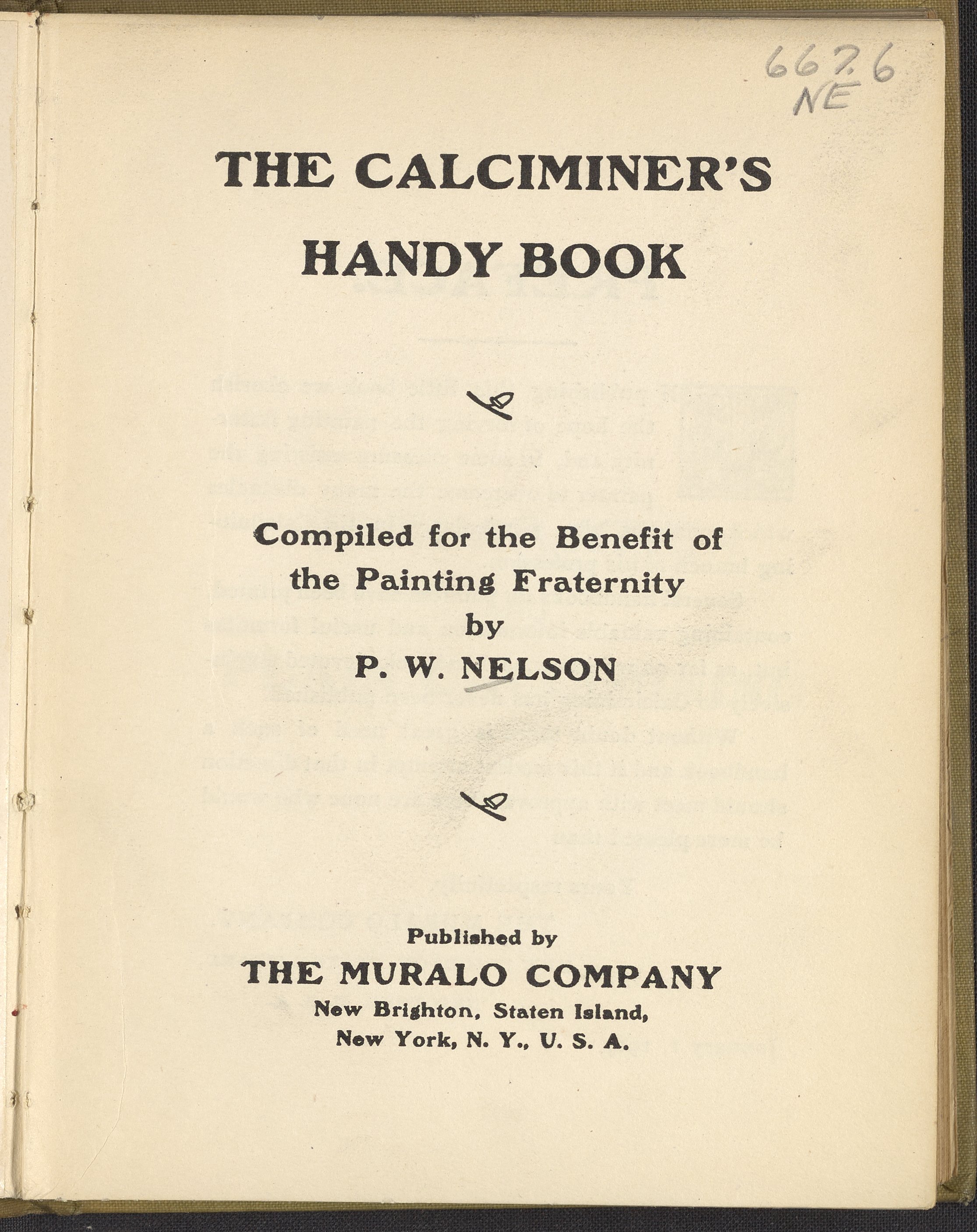 Nelson, Peter William. The Calciminer's Handy Book. New Brighton, New York, New York: Muralo Company, 1907. https://digital.sciencehistory.org/works/g8bruql.