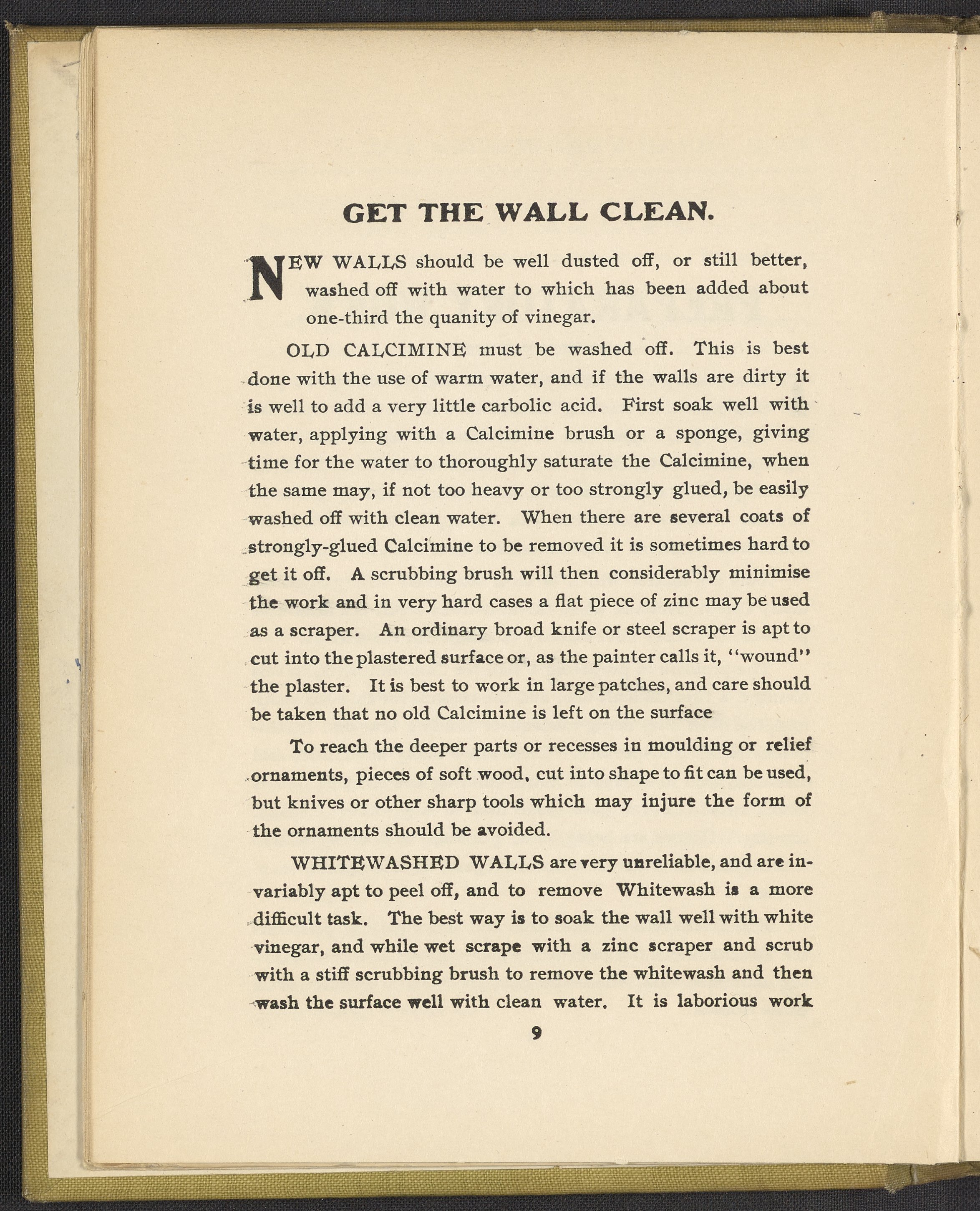 Small JPG1200 x 1535px — 521 KBFull-sized JPG2278 x 2914px — 1.6 MBOriginal fileTIFF — 2278 x 2914px — 19.1 MBVolume describes the properties, varieties, and application process of calcimine wall color treatment. The work includes color plates showing color relationships, Calcimo brand wall colors for sale from the Muralo company, and decorative schemes. The frontispiece depicts a black-and-white portrait of the author. Work is digitized in its entirety.