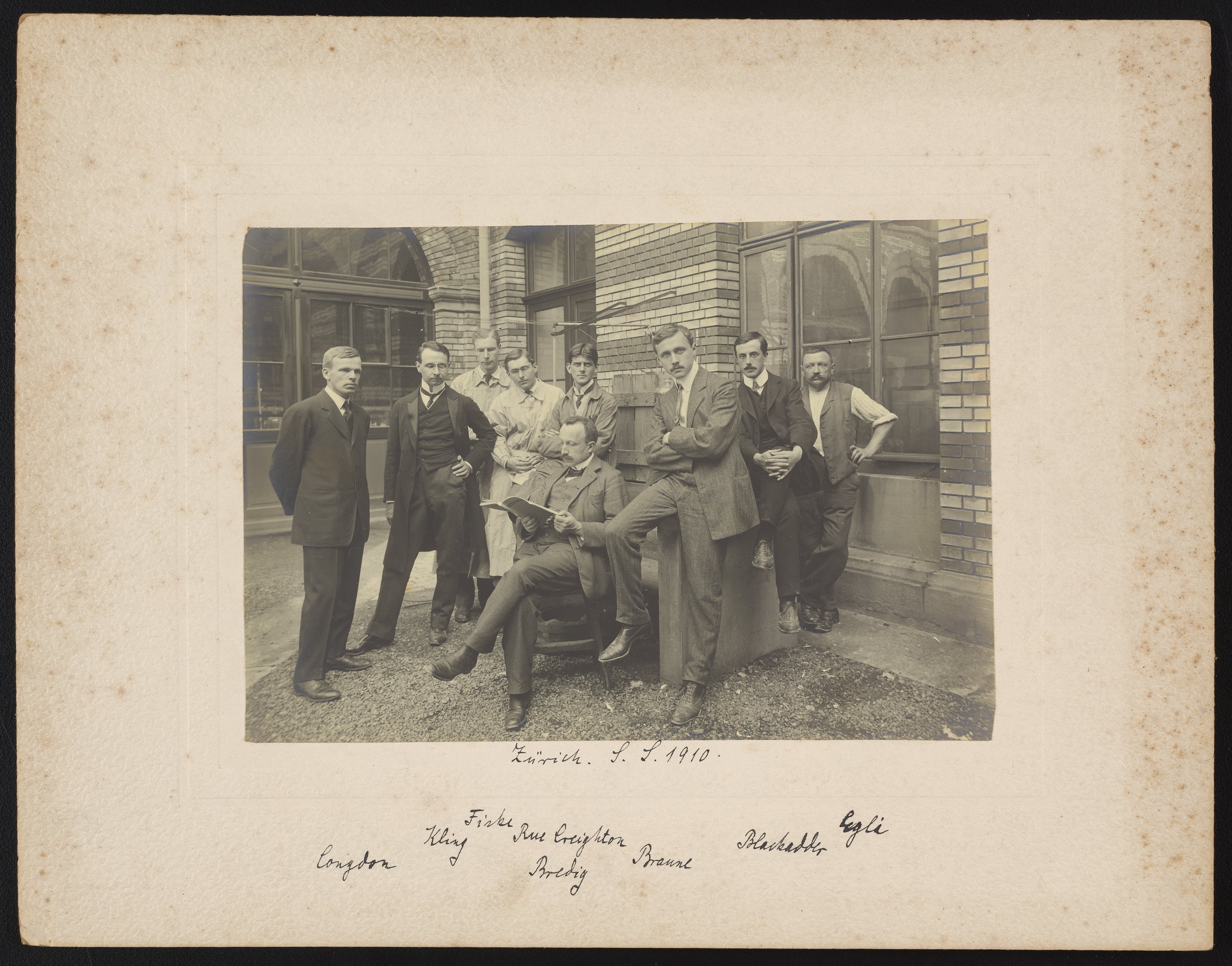 Small JPG1200 x 942px — 184 KBLarge JPG2880 x 2259px — 1007 KBFull-sized JPG6627 x 5199px — 4.8 MBOriginal fileTIFF — 6627 x 5199px — 98.6 MBBlack and white photograph of Georg Bredig (1868-1944) and fellow chemists at the Technische Hochschule, in Zürich, Switzerland. Bredig is seated and reading a book while his colleagues pose around him. Bredig has annotated the names of those pictured beneath the photograph. He has identified, from left to right, Edgar Davidson Congdon (1879-1970, "Kling," Paul S. Fiske, "Rue," H. Jermain Creighton (1886-), "Braune," Thomas Blackadder (1887-1953), and "J. Egli."