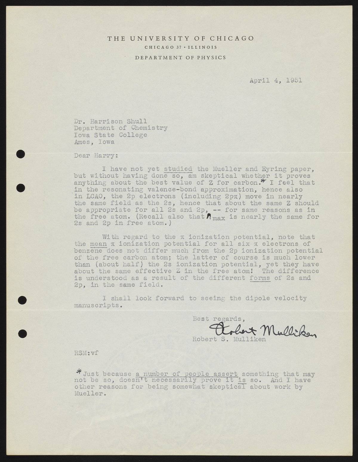 Letter from Robert S. Mulliken to Harrison Shull, 1951