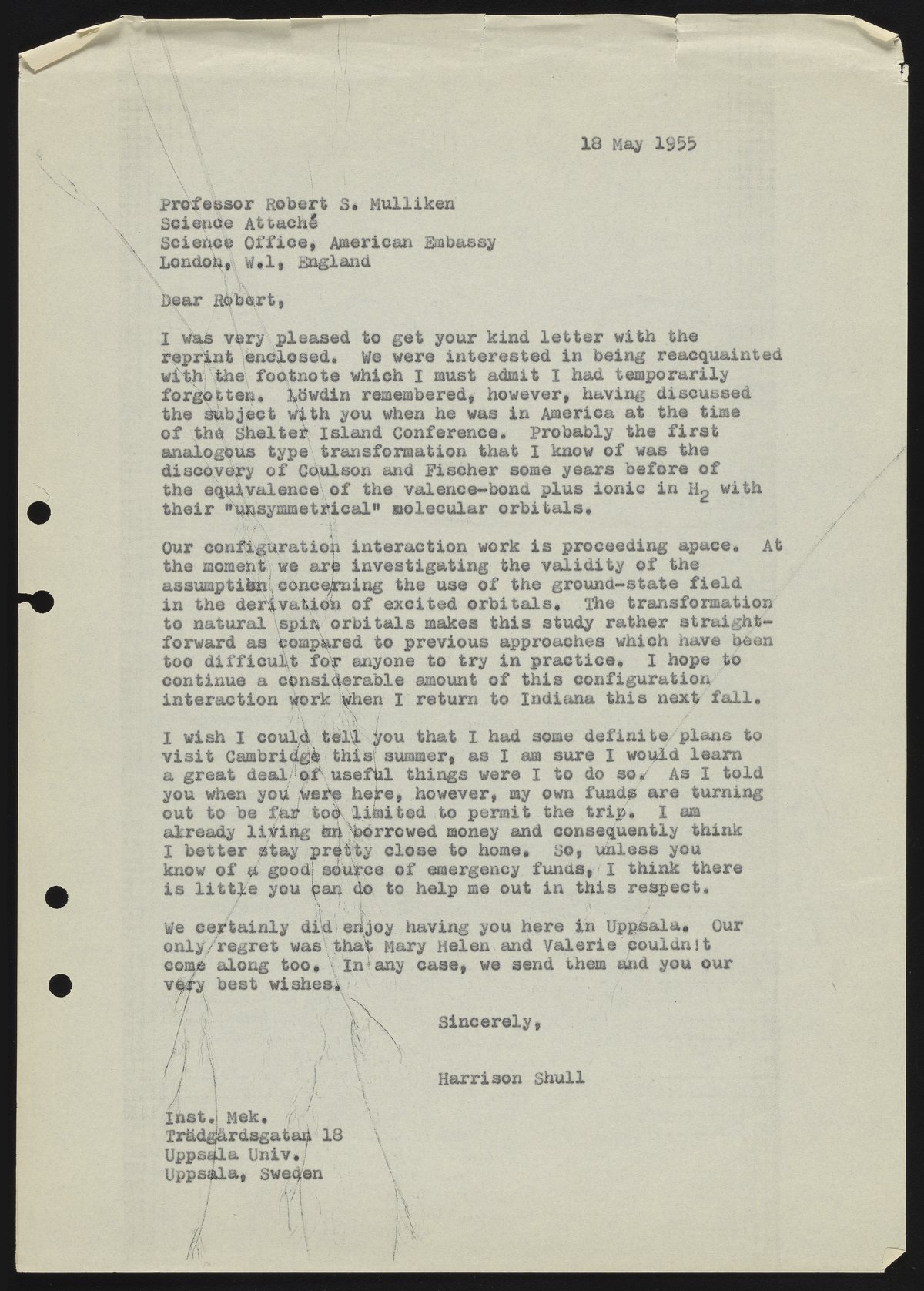 Shull, Harrison. “Letter from Harrison Shull to Robert S. Mulliken, 1955,” May 18, 1955. Robert S. Mulliken & Harrison Shull Correspondence, Box 1. Science History Institute. Philadelphia. https://digital.sciencehistory.org/works/gb19f587n.