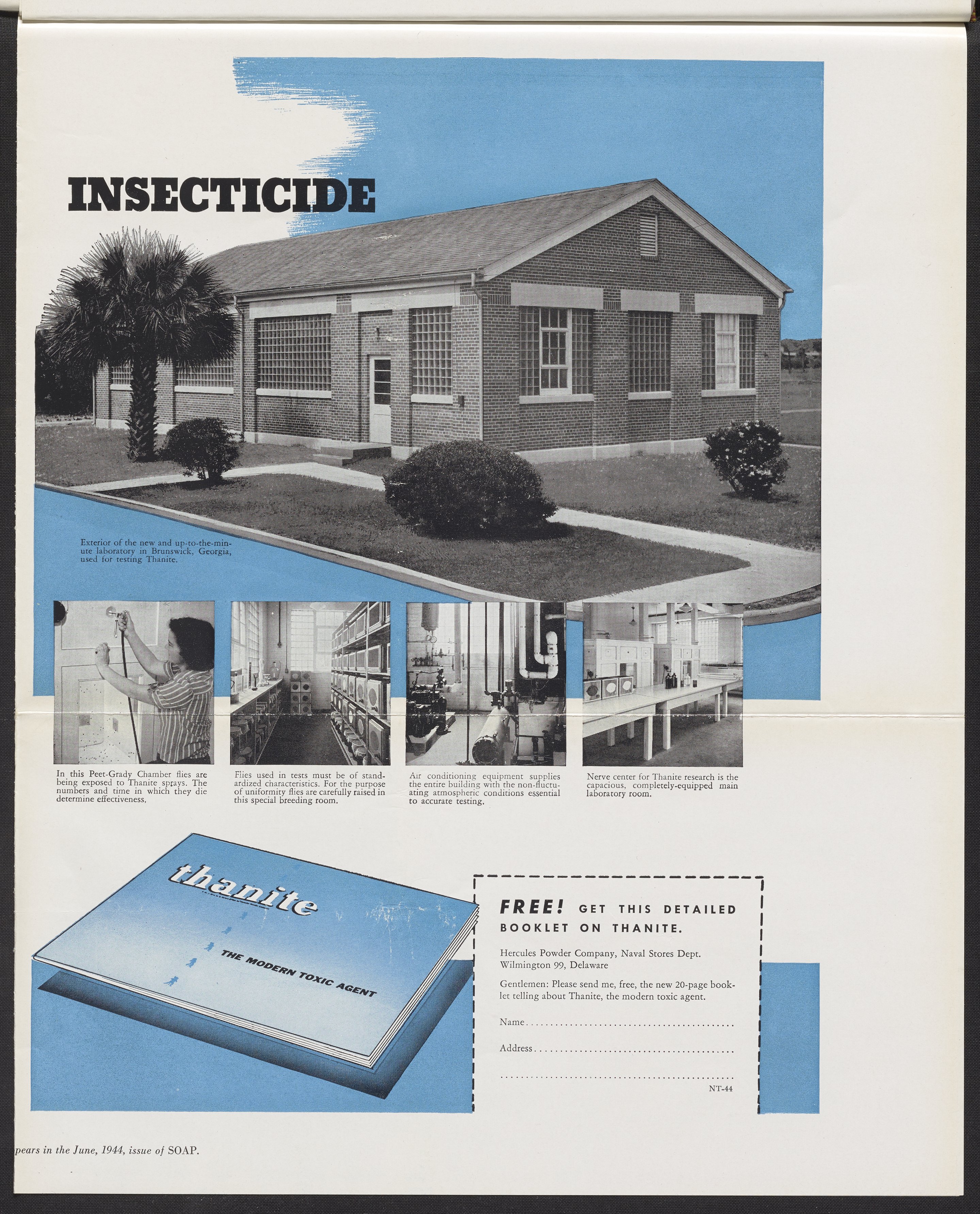 Hercules Incorporated. “Advertisement for Hercules Thanite Insecticide.” 1944 Hercules Advertisements, 1944. Records of Hercules Incorporated, Volume 1944. Science History Institute. Philadelphia. https://digital.sciencehistory.org/works/gb19f667c.