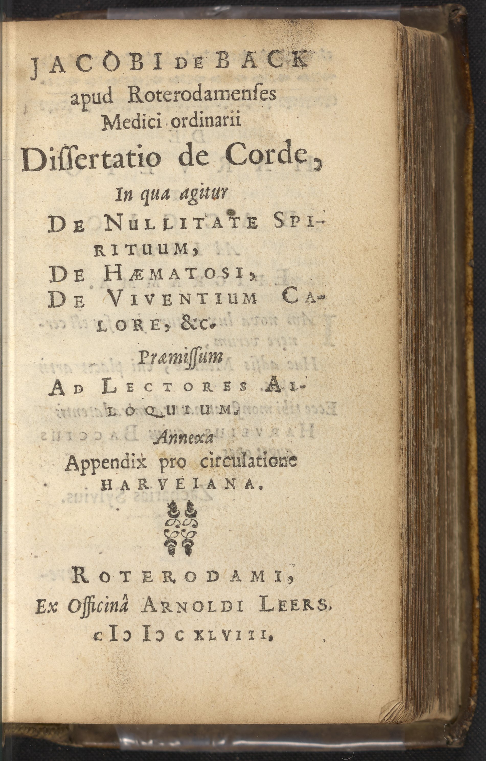 Also bound in this volume are Dissertation de corde (Rotterdam, 1648) by Jacobi de Back (1594-1658), an early Dutch adherent of Harvey's, as well as the first edition of Harvey’s Exercitationes duae anatomicae de circulatione sanguinis (Rotterdamn, 1649), his first extended defense of his discoveries since their initial publication 21 years earlier. Title pages and plates have been digitized.