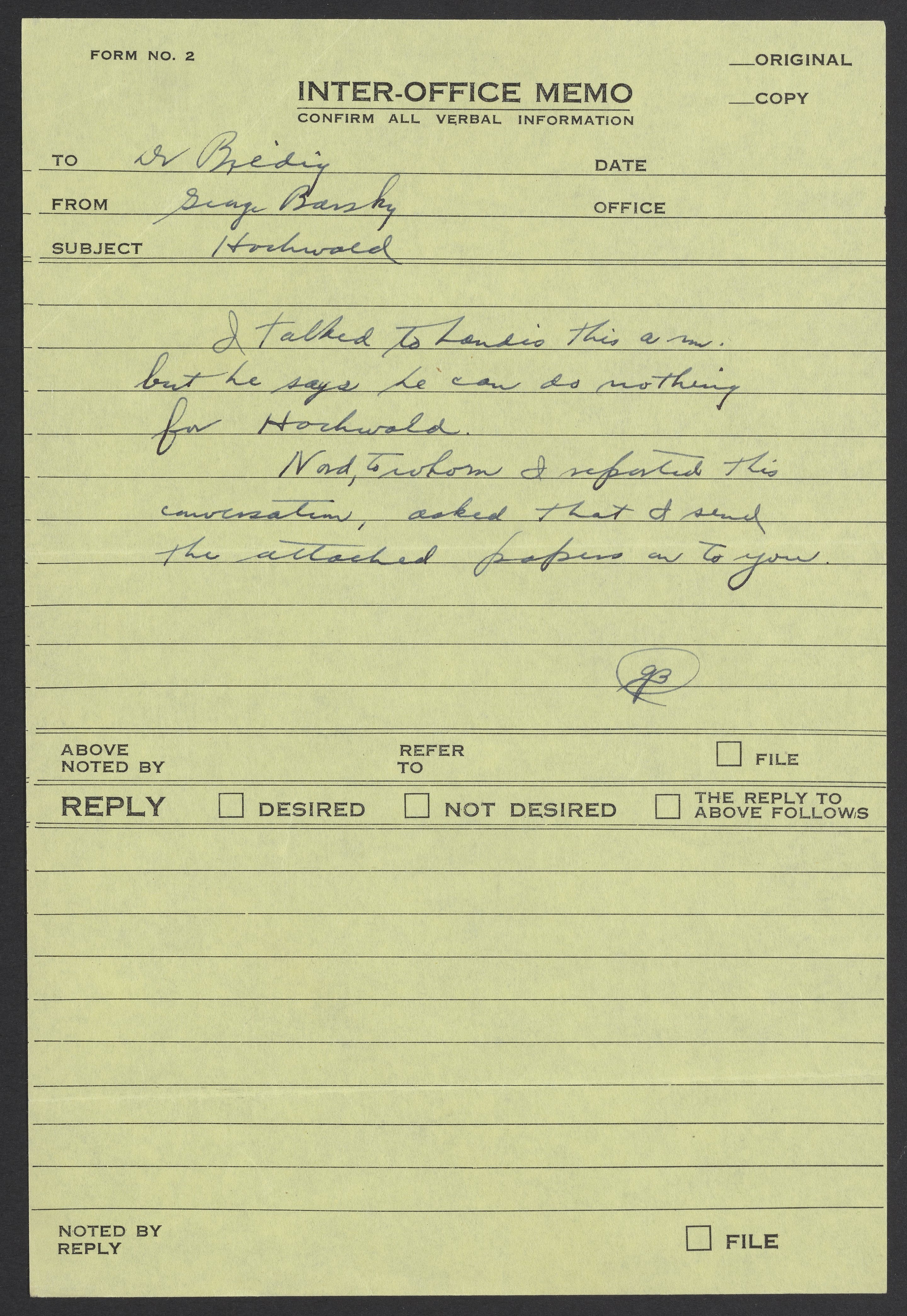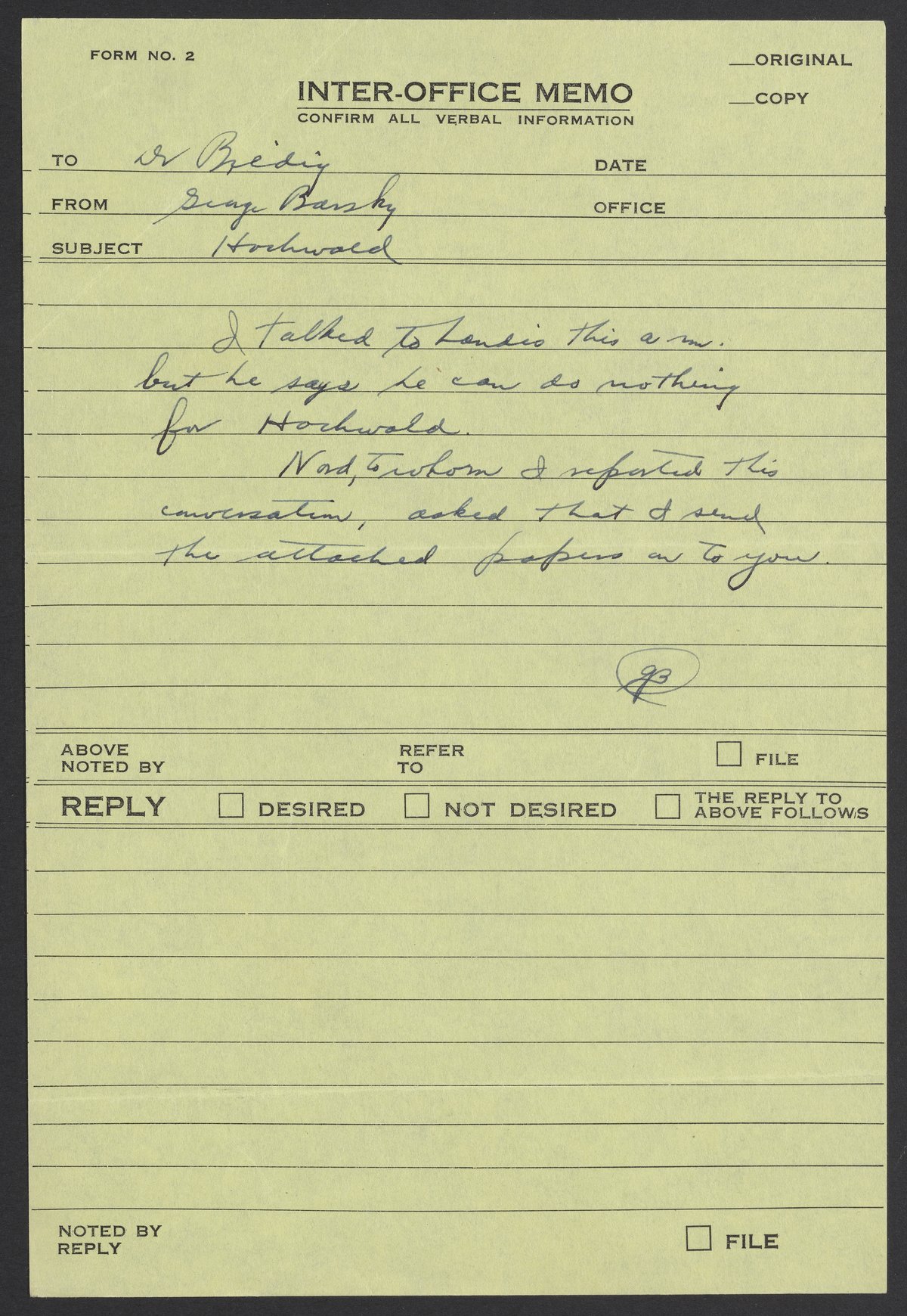 Memo in which George Barksy tells Max Bredig (1902-1977) that "Landis" cannot help Fritz Hochwald (1897-1968). Barksy reports that Franz Friedrich Nord (1889-1973) suggested sending the papers which were seemingly attached to the memo.