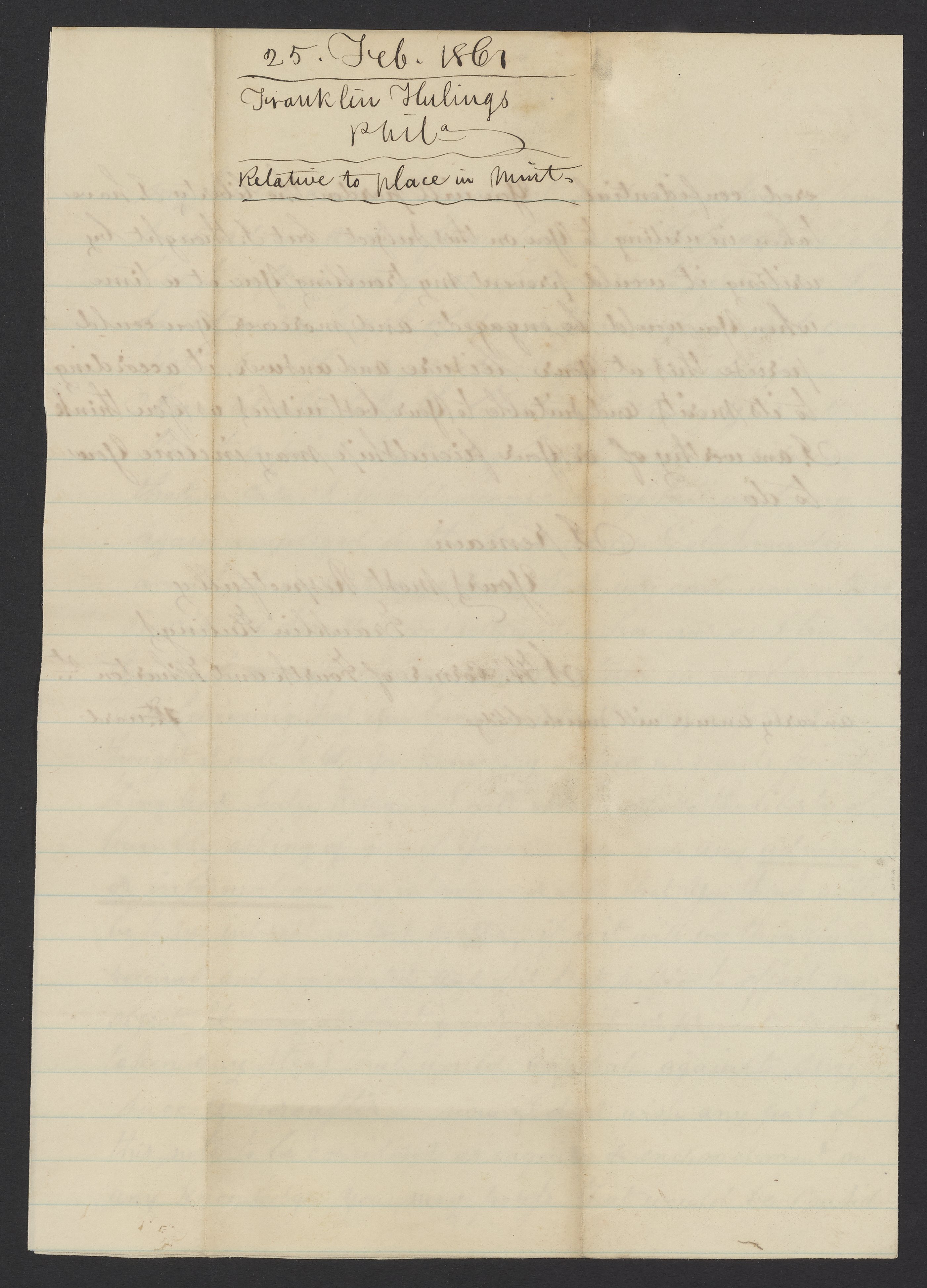 Small JPG1200 x 1673px — 330 KBFull-sized JPG2802 x 3906px — 1.4 MBOriginal fileTIFF — 2802 x 3906px — 31.4 MBFranklin Hulings discusses his concerns with the political differences between his potential references, "Mr. King, Judge Kelly, and Judge Campbell" and the Mint's Director, Col. Snowden, as Hulings attempts to be reinstated as an employee to the United States Mint.