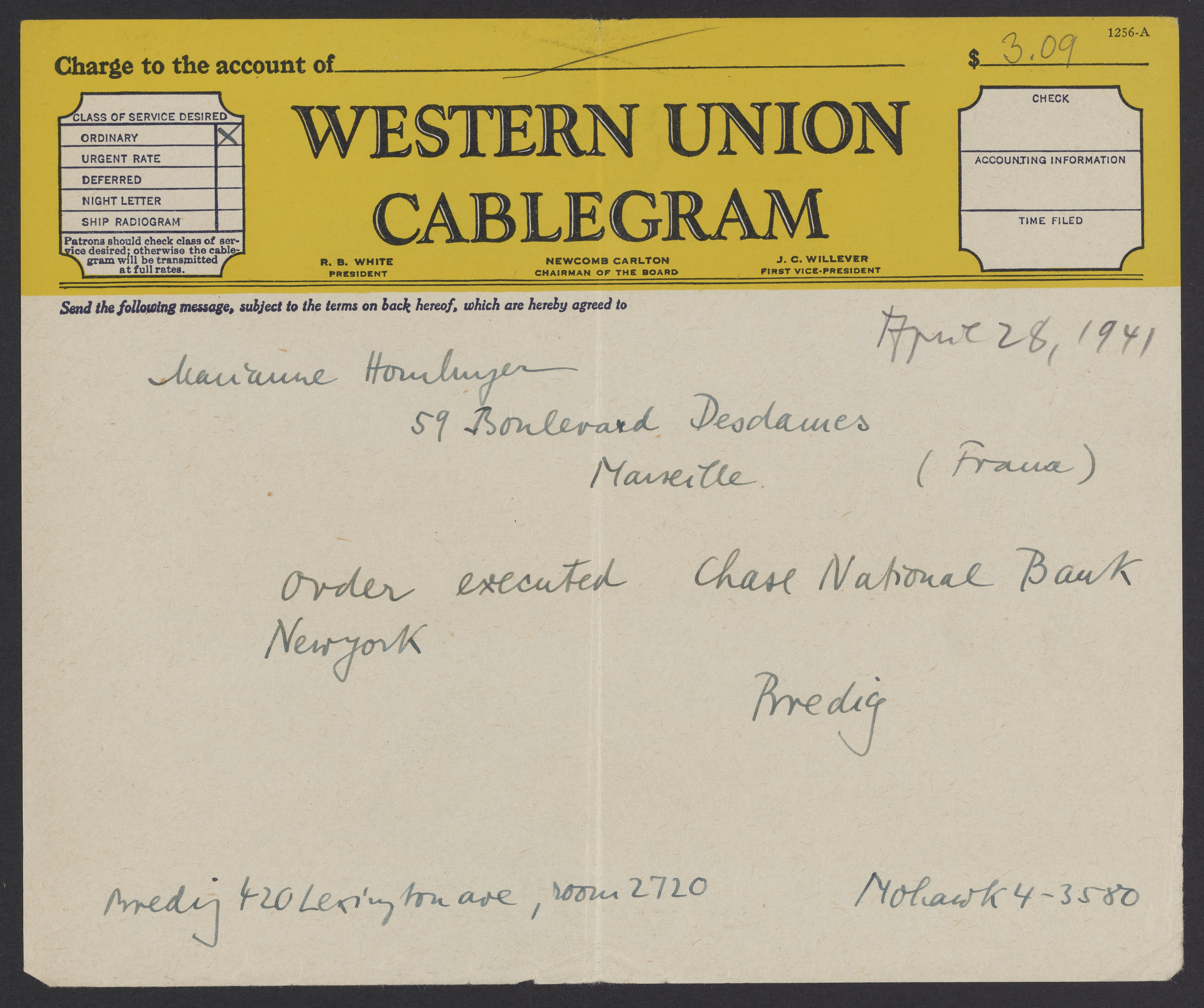 Cablegram from Max Bredig to Marianne Homburger, April 28, 1941