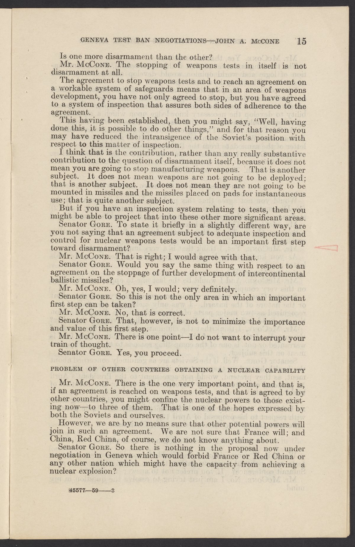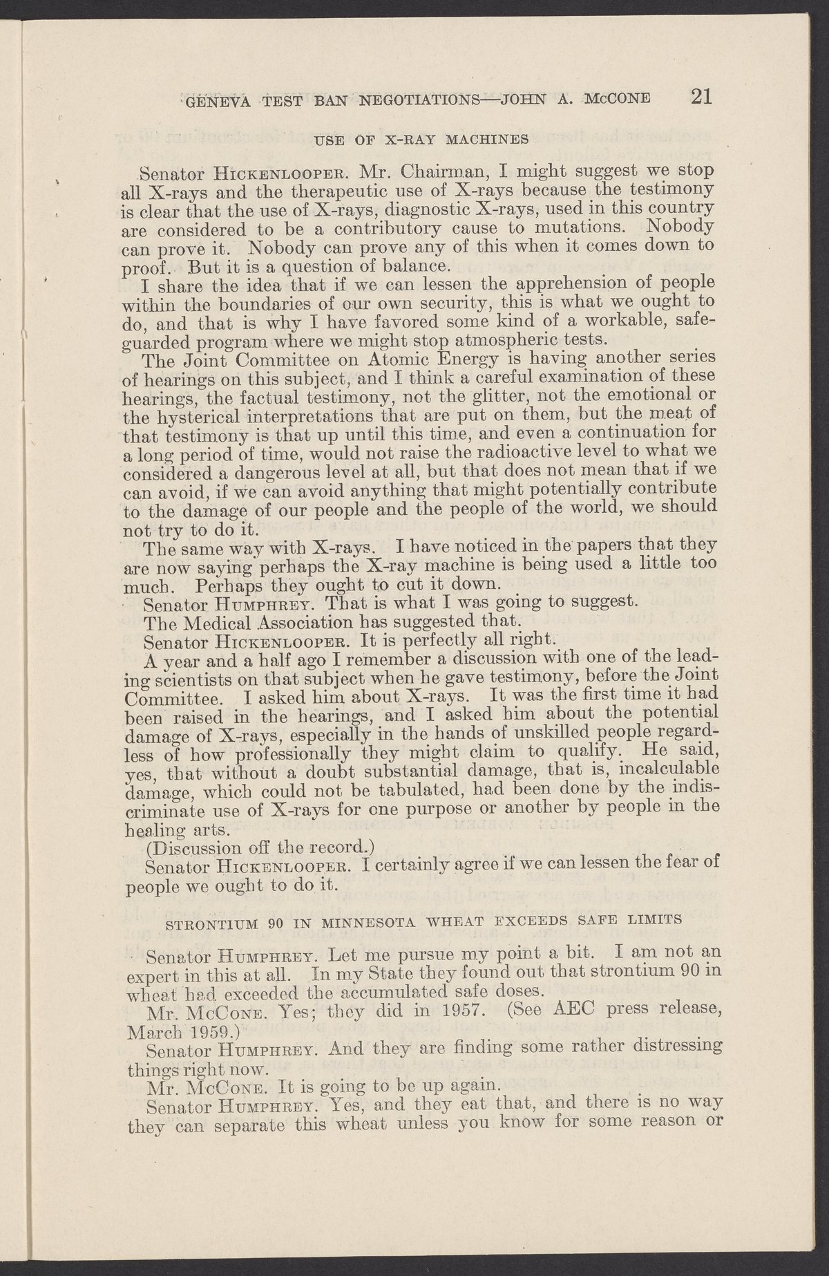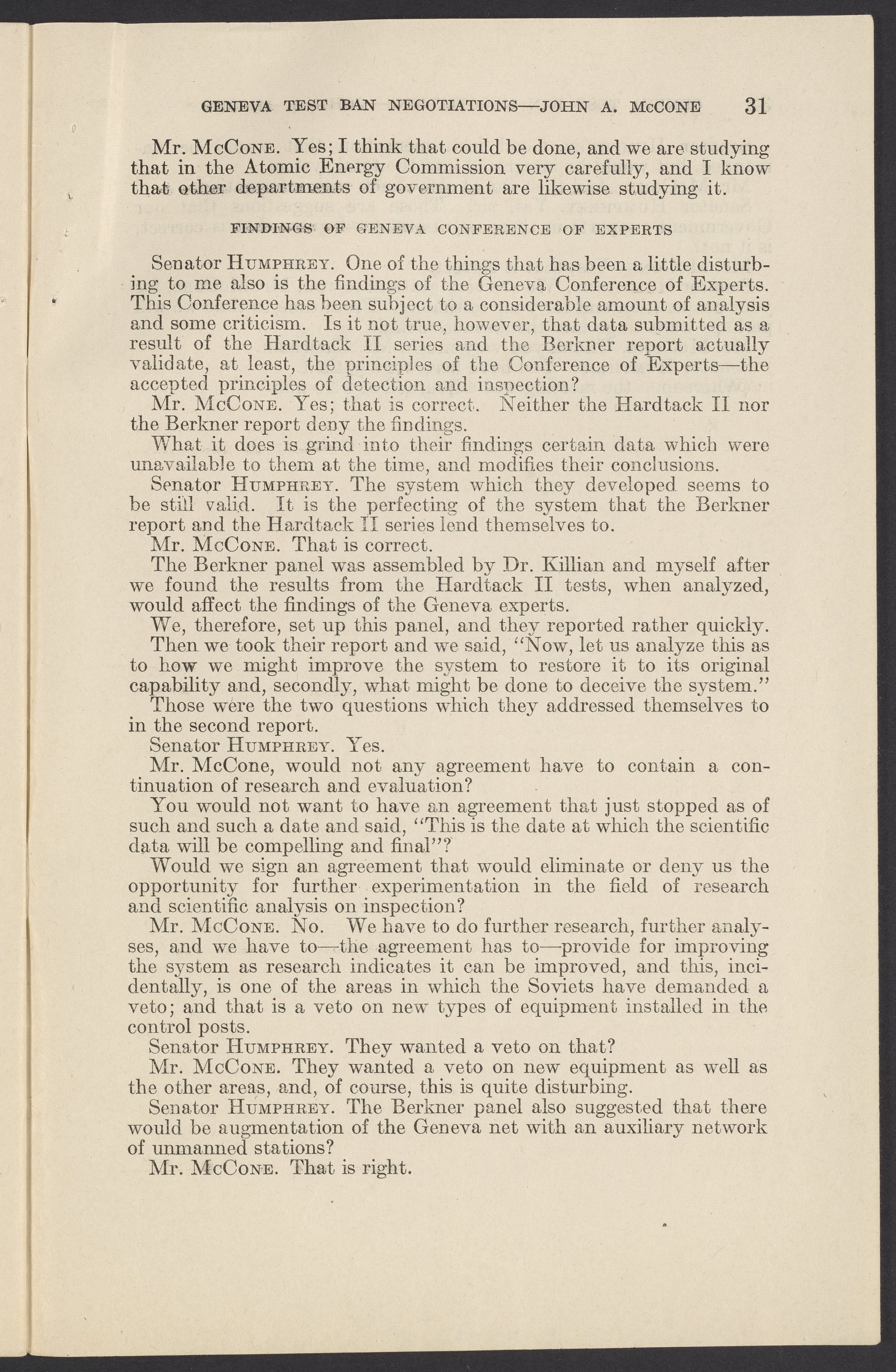 Small JPG1200 x 1831px — 279 KBLarge JPG2880 x 4394px — 1.5 MBFull-sized JPG3774 x 5758px — 2.4 MBOriginal fileTIFF — 3774 x 5758px — 62.2 MBTestimony of John A. McCone (1902-1991), chair of the Atomic Energy Commission (AEC), on Geneva test ban negotiation, given in hearing before the Subcommittee on Disarmament of the Committee on Foreign Relations, United States Senate.