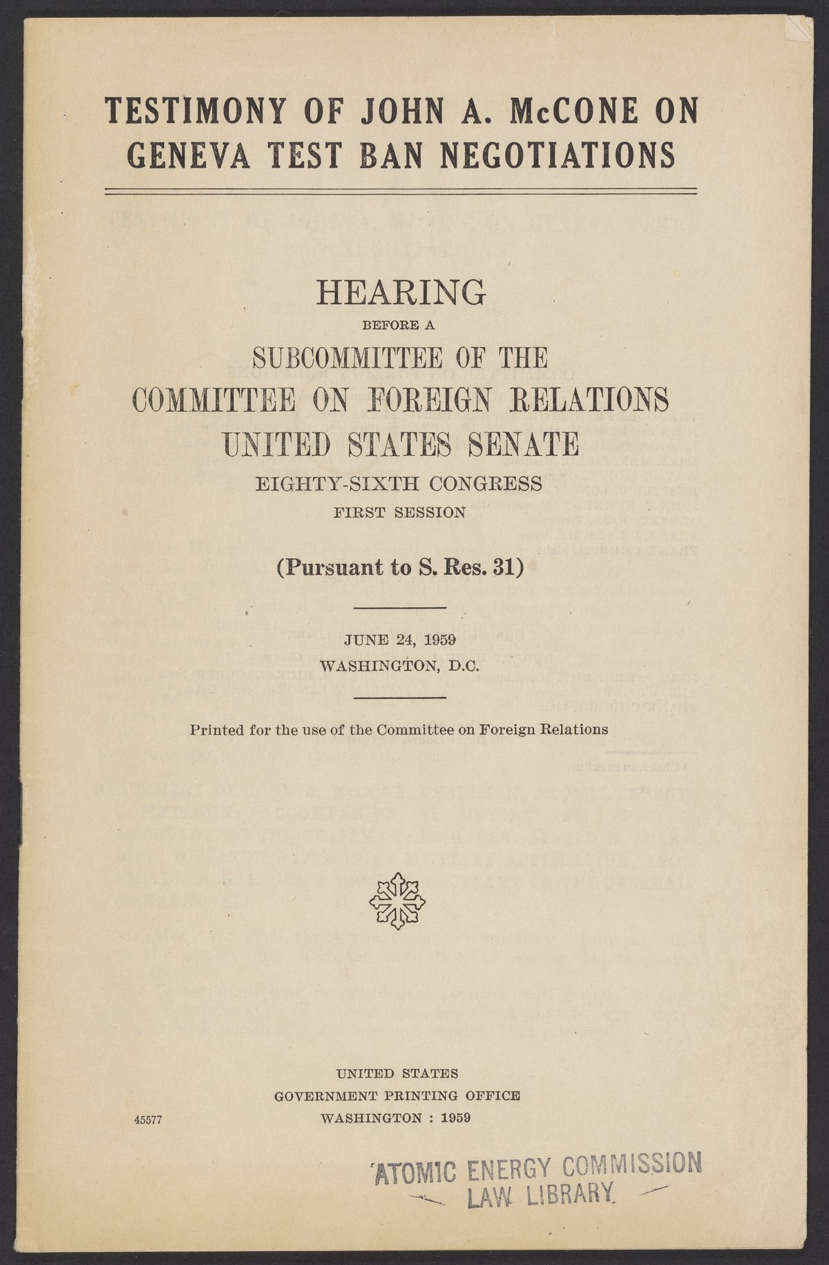 “Testimony of John A. McCone on Geneva Test Ban Negotiations.” United States. Government Printing Office., June 24, 1959. Papers of Spofford Grady English, Box 1, Folder 27. Science History Institute. Philadelphia. https://digital.sciencehistory.org/works/gg866h9.
