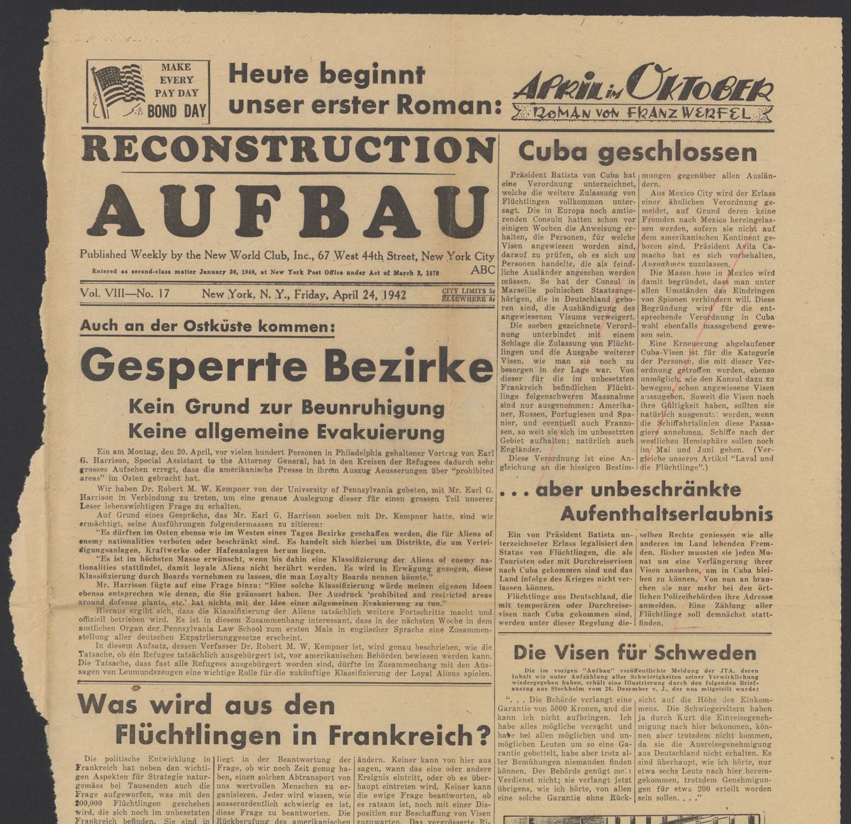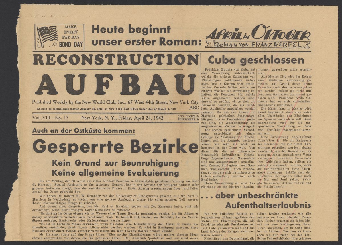 “Aufbau, Volume 8, Number 17.” Aufbau (New York, N.Y.), April 24, 1942. Papers of Georg and Max Bredig, Box 7, Folder 26. Science History Institute. Philadelphia. https://digital.sciencehistory.org/works/gh1d85h.