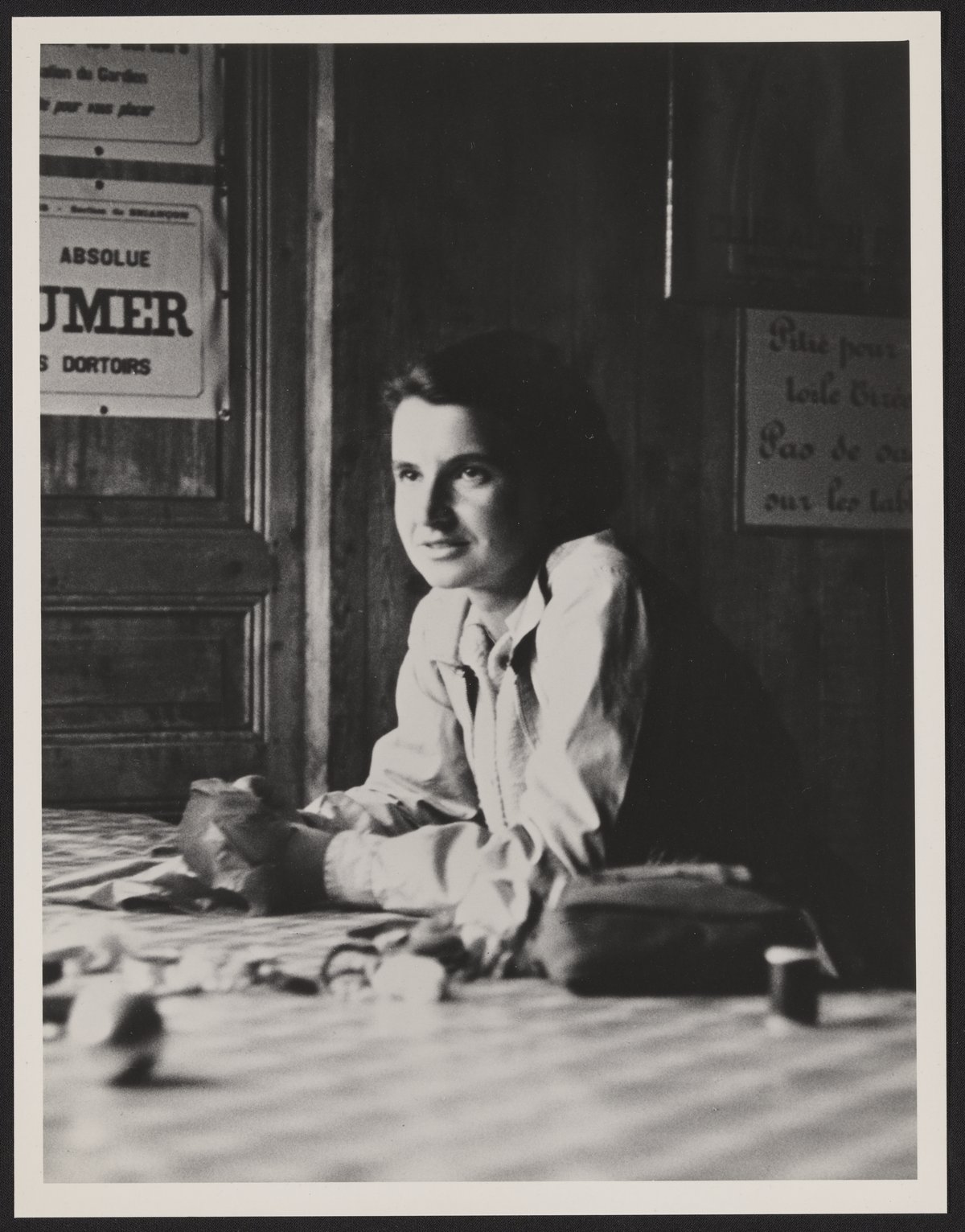 Luzzati, Vittorio. “Photograph of Rosalind Franklin Sitting at a Table,” July 1950. History of Molecular Biology Collection, Box 10, Folder 14. Science History Institute. Philadelphia. https://digital.sciencehistory.org/works/gh64ugl.