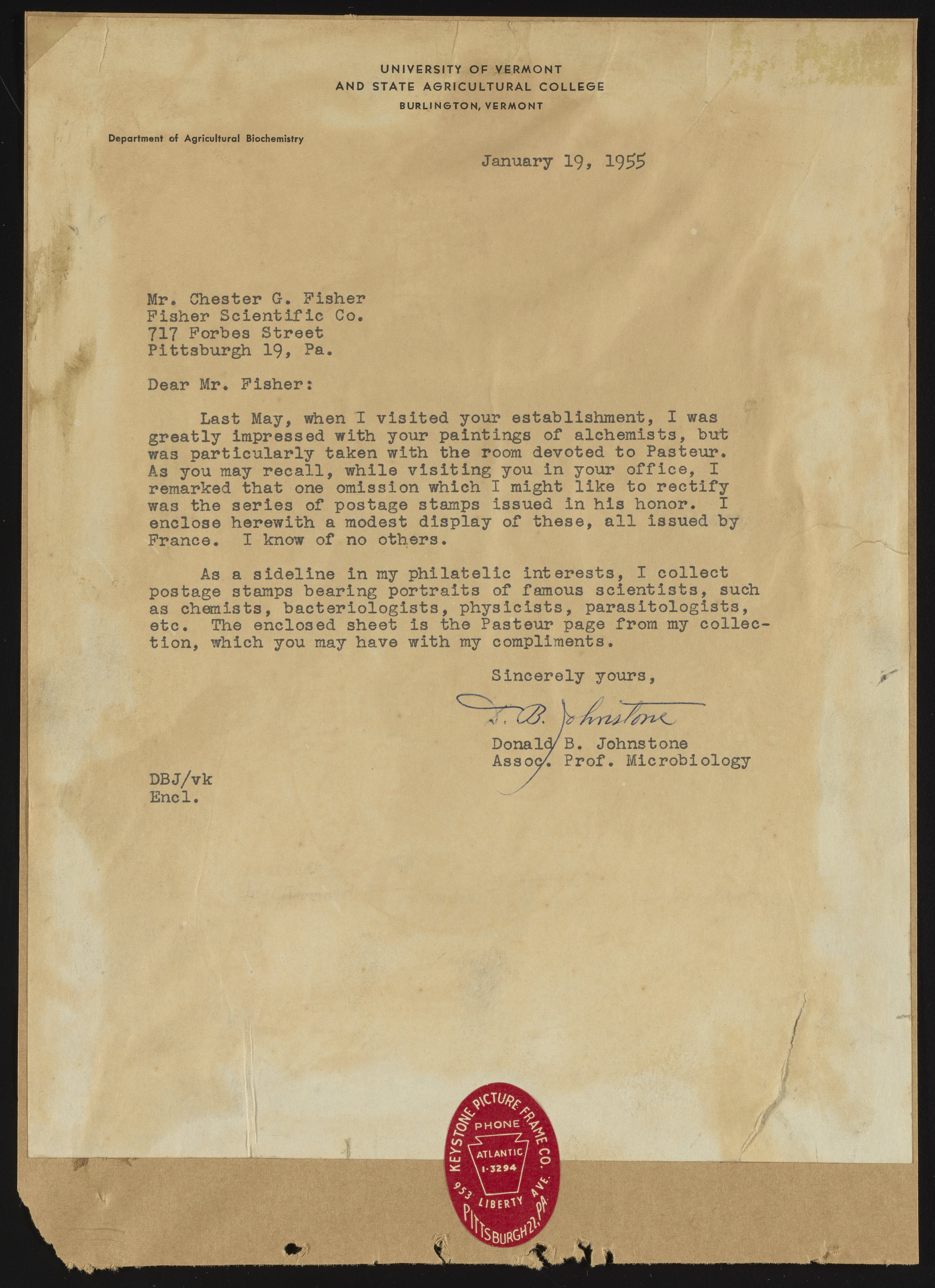 Letter from Donald B. Johnstone (1919-2018) to Chester G. Fisher (1881-1965) regarding enclosed stamps commemorating Louis Pasteur (1822-1895). Donald B. Johnstone was the Associate Professor of Microbiology at the University of Vermont at the time of writing this letter. See Related Items section below for mounted stamp page gifted to Fisher.