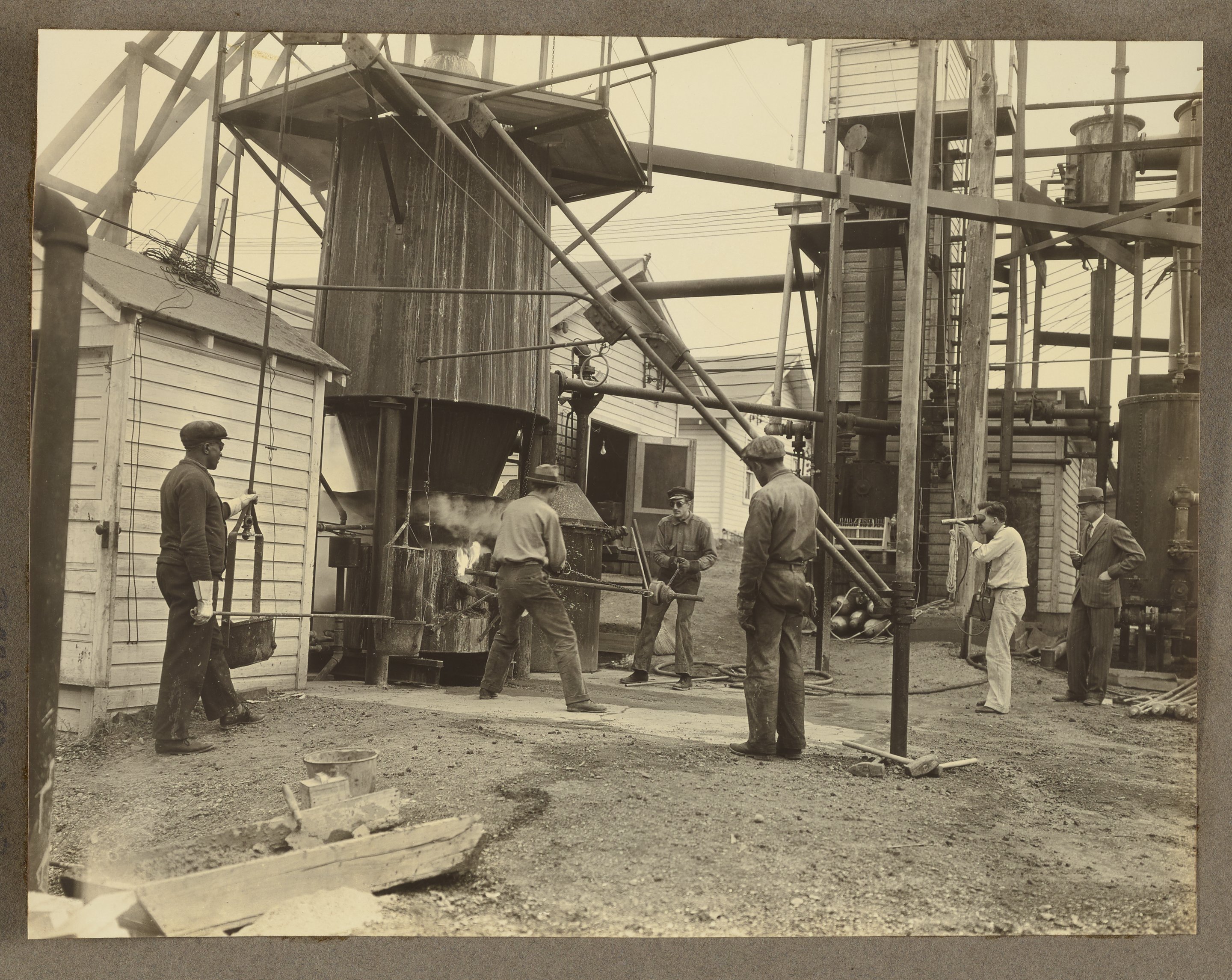 General view of workers opening the cinder-notch on the No. 2 experimental blast furnace on a burden (a load, especially a heavy one) of phosphate at the U.S. Department of Agriculture's Fixed Nitrogen Research Laboratory located in Washington, D.C. The cinder-notch is the opening in a blast furnace through which molten slag flows out. Per a notation accompanying the photograph, the individuals present are identified as follows (in no particular order): Overhall; Clark; Lansdon; Hill; Reed; and Royster.