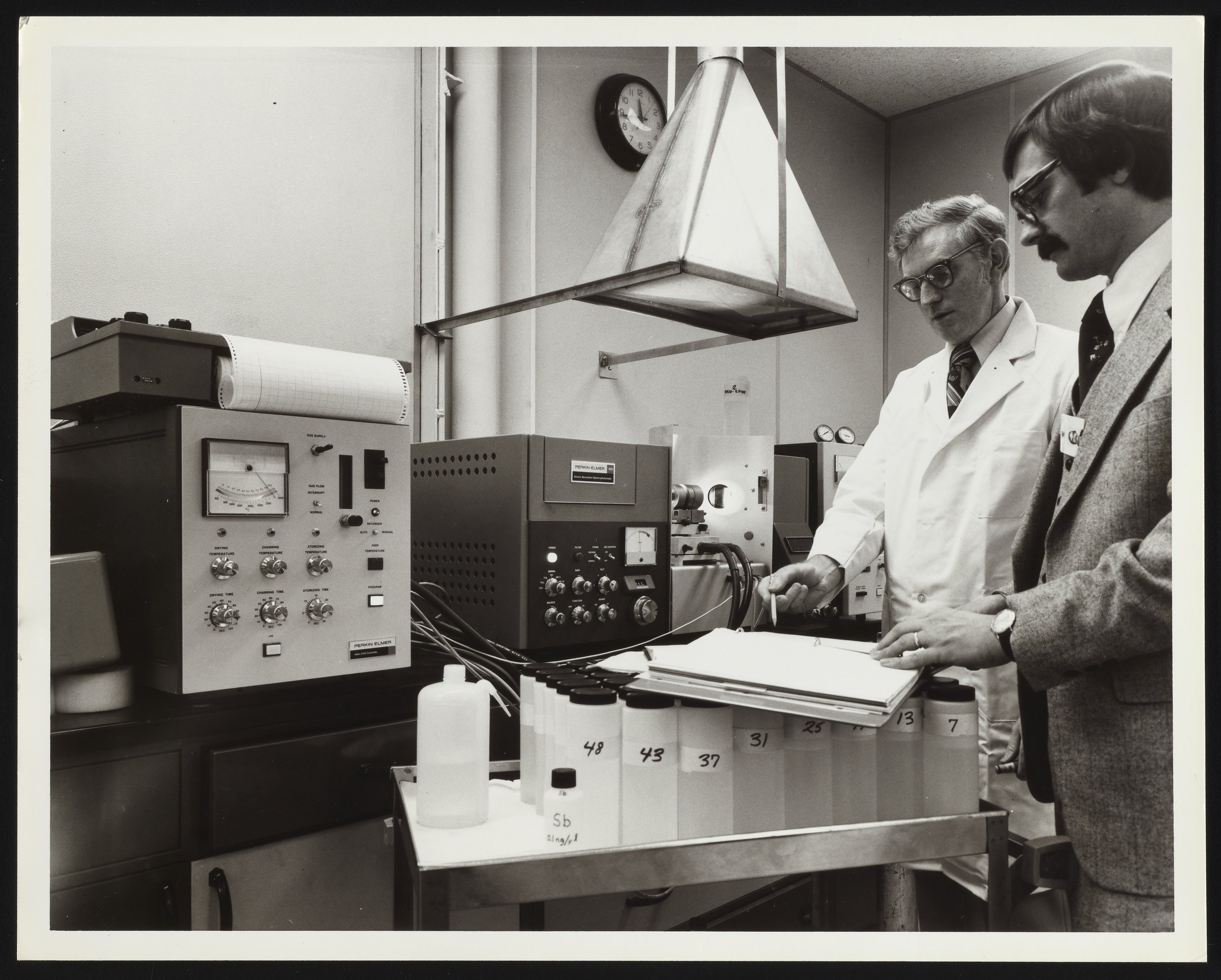 General view of employee Jack Guillaumin (right) and an unidentified chemist reviewing the results of an analysis conducted by a Perkin-Elmer Model 306 Atomic Absorption Spectrophotometer in a laboratory at the Detroit Edison Company. Per notations accompanying the photograph, the atomic absorption spectrophotometer is equipped with a heated graphite atomizer (HGA) and was used to test for the presence of trace metals in samples of river water taken from the company's plant in Marysville, Michigan.