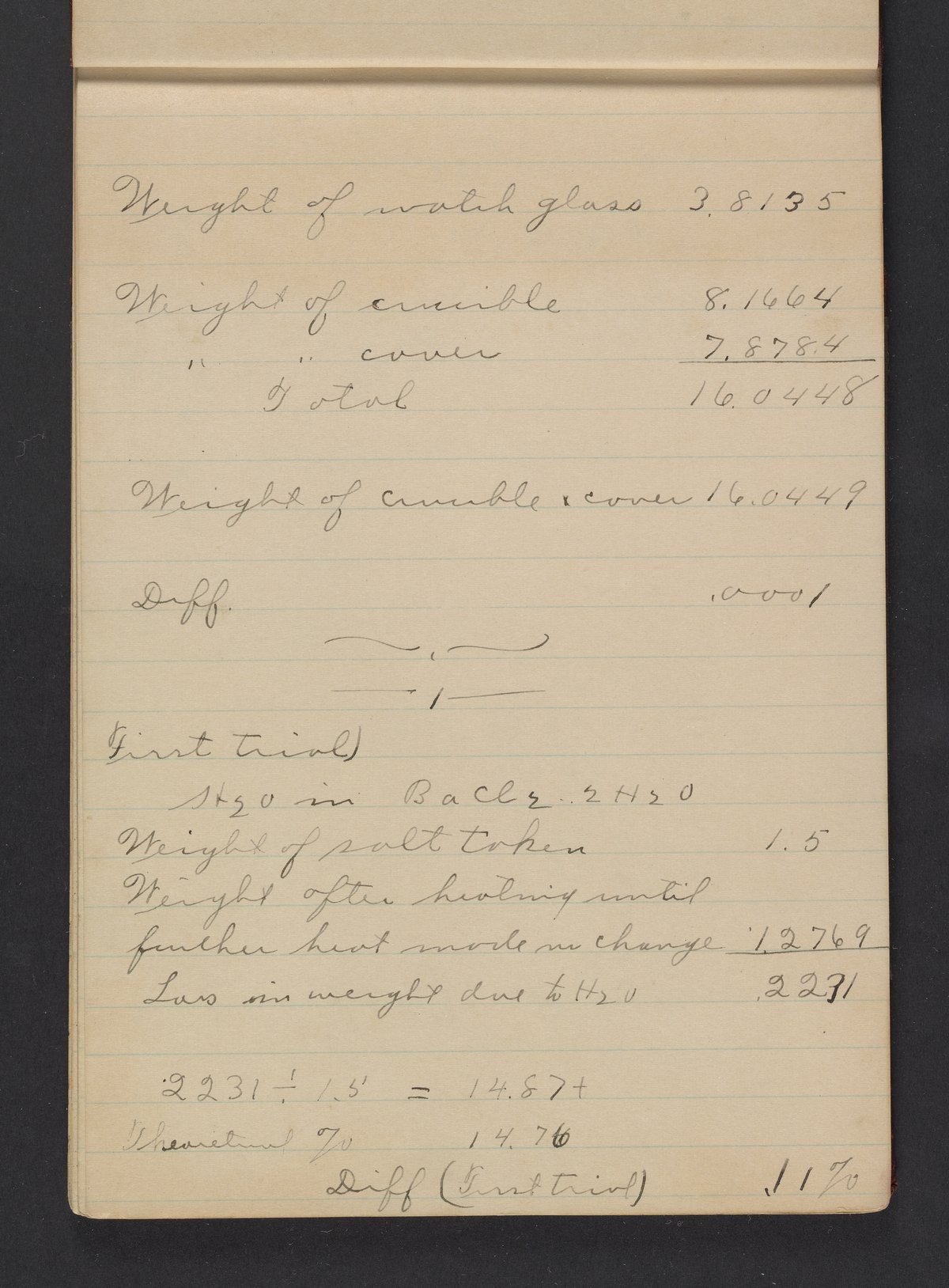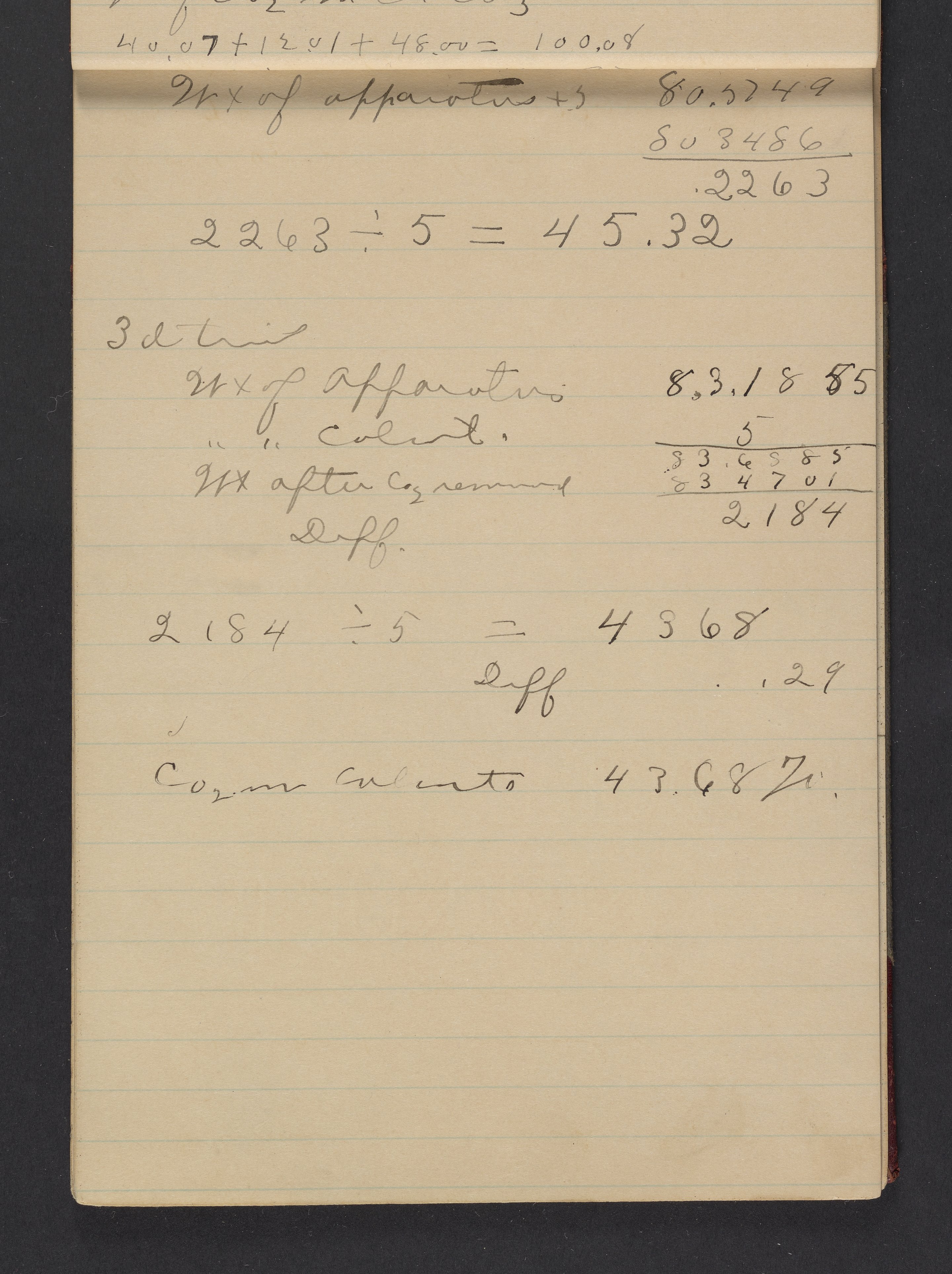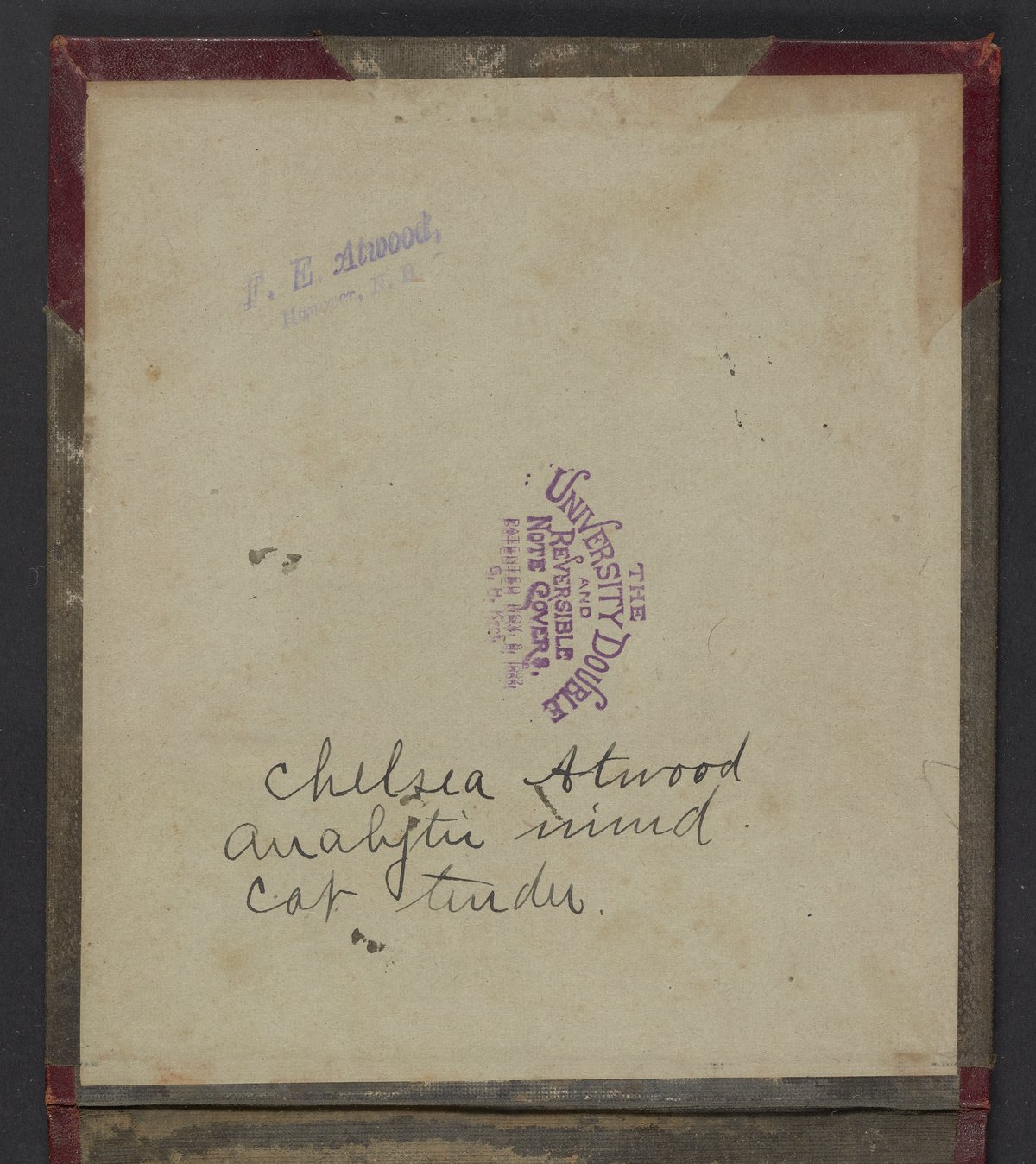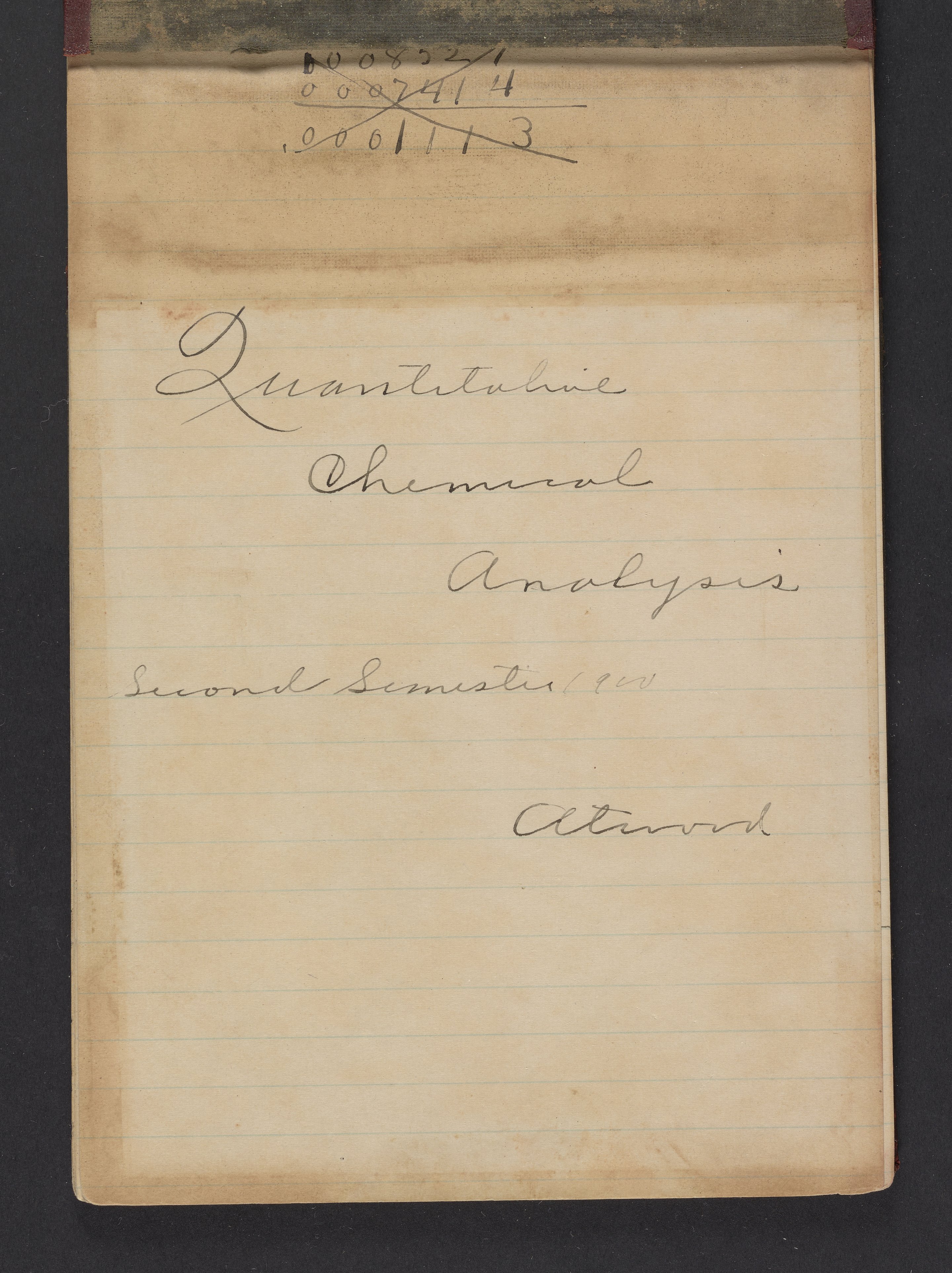 Small JPG1200 x 1605px — 253 KBLarge JPG2880 x 3851px — 1.7 MBFull-sized JPG4110 x 5496px — 3.5 MBOriginal fileTIFF — 4110 x 5496px — 64.7 MBNotebook used by Frederick Edwin Atwood (1875-1948) during a quantitative chemical analysis course taken at Dartmouth College in Hanover, New Hampshire. A native of Chelsea, Vermont, Atwood received his Bachelor of Science from Dartmouth College in 1900.