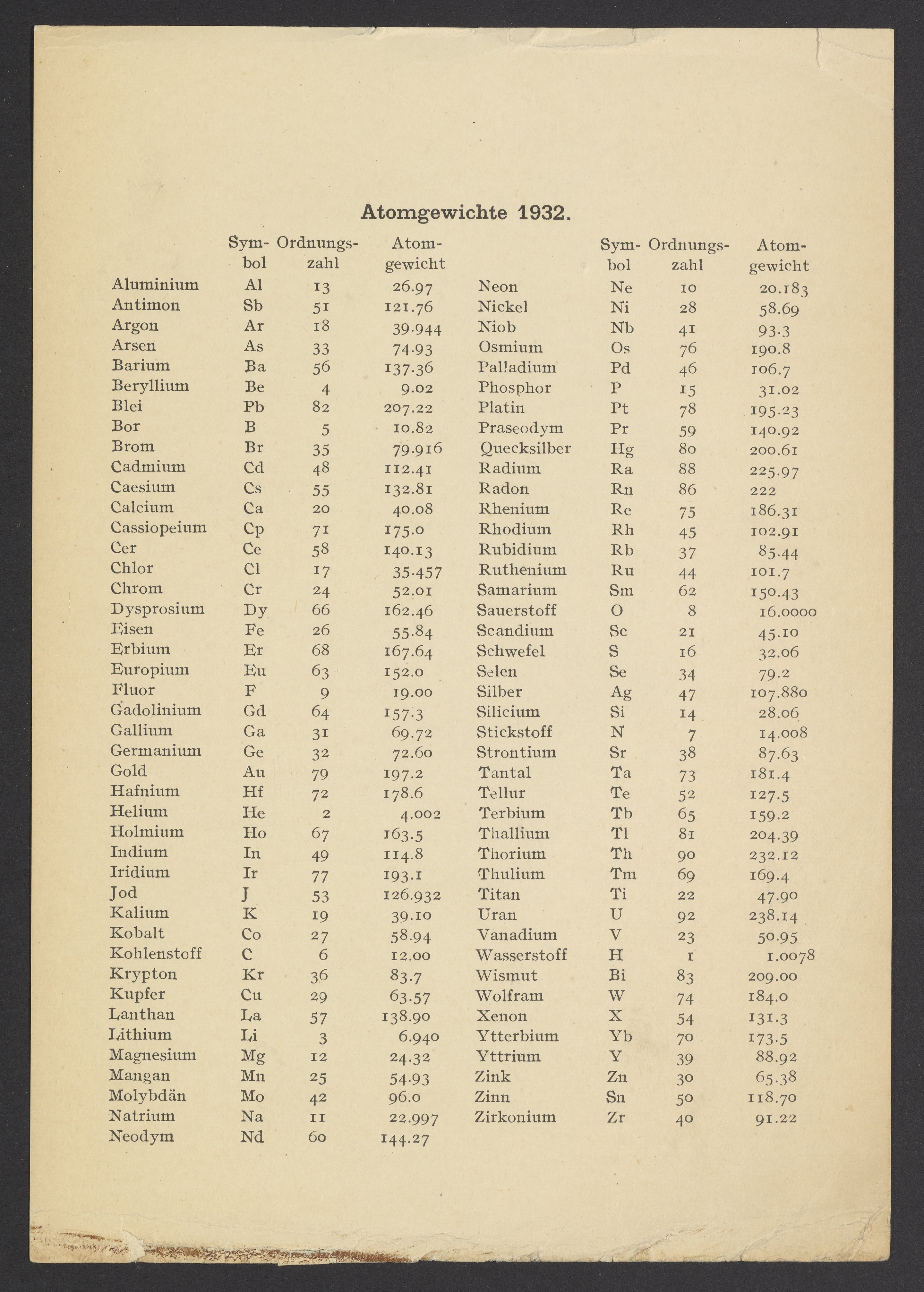 “Atomic Weights,” 1932. Papers of Georg and Max Bredig, Box 10, Folder 33. Science History Institute. Philadelphia. https://digital.sciencehistory.org/works/gm01ihq.