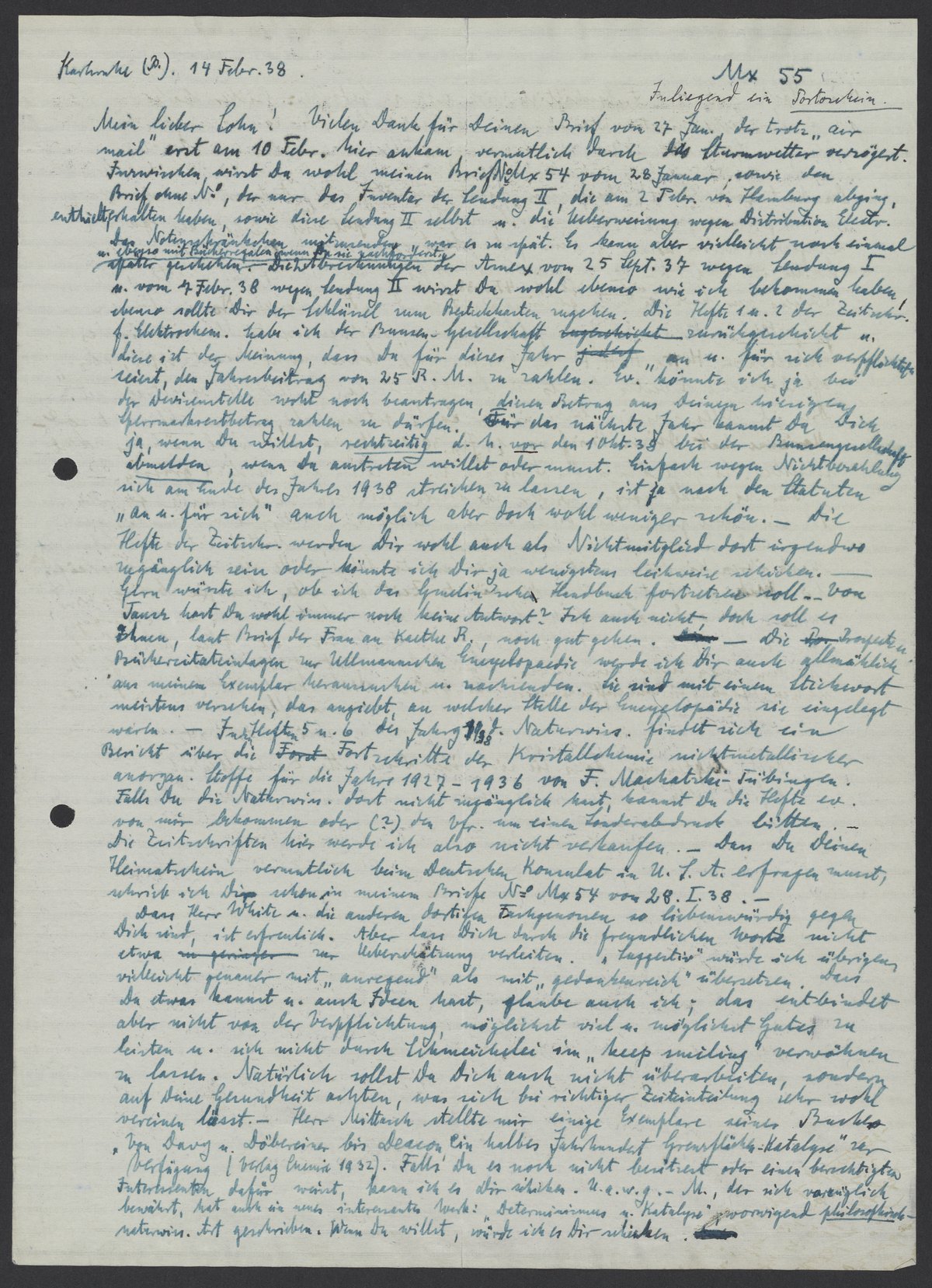 Thank you very much for your letter from Jan. 27, which, despite "airmail", only arrived here on February 10th. It was probably delayed by the stormy weather. In the meantime, you will have received my letter Mx # 54 from January 28th, as well as the letter without a number, which only contained the inventory of shipment II, which left Hamburg on February 2nd, shipment II, and the transfer of your stocks. It was too late to send the music note cabinet. However, perhaps it can happen later, just like with bookshelves if they are rearranged. You will probably have received the two bills from American Express dated September 25, 1937, for shipment I and February 4, 1936, for shipment II, just like I did, and you should also receive the keys for the cutlery box. I have just sent back issues 1 and 2 of the Journal of Electrochemistry to the Bunsen Society. They believe that you are obliged to pay the annual fee of 25 RM for this year. I could possibly still apply to the foreign exchange office to be allowed to pay this amount from your local blocked mark account. For the next year, if you wish, you can unregister from the Bunsen Society before October 1, 1938, especially if you want or must leave it. You could probably just not pay at the end of 1938 according to the statute, but that is not very nice. The journal issues will probably be accessible to you as a non-member somewhere there or I could at least send them to you on loan. Should I continue Gmelin's manual? Do you still not have a response from Tausz? Neither do I, but according to the woman's letter to Kaethe R., they should still be fine. I will also gradually look for the prospectuses and book inserts for Ullman’s encyclopedia from my copy and forward them to you. They are usually provided with a keyword that indicates where in the encyclopedia they were inserted. In issues 5 and 6 of Natural Science from the year 1938, there is a report on the advances in crystal chemistry of non-metallic inorganic substances for the years 1927-1936 by F. Mashatski -Tübingen. If you do not have access to Natural Sciences there, you can possibly receive the issues from me or Viktor Fraenkel as a special reprint. Hence, I’m not going to see the journals here. I already wrote in my letters No. Mx 54 of 28.1.38 that you probably must ask the German consulate in the U.S.A. for your residence certificate.