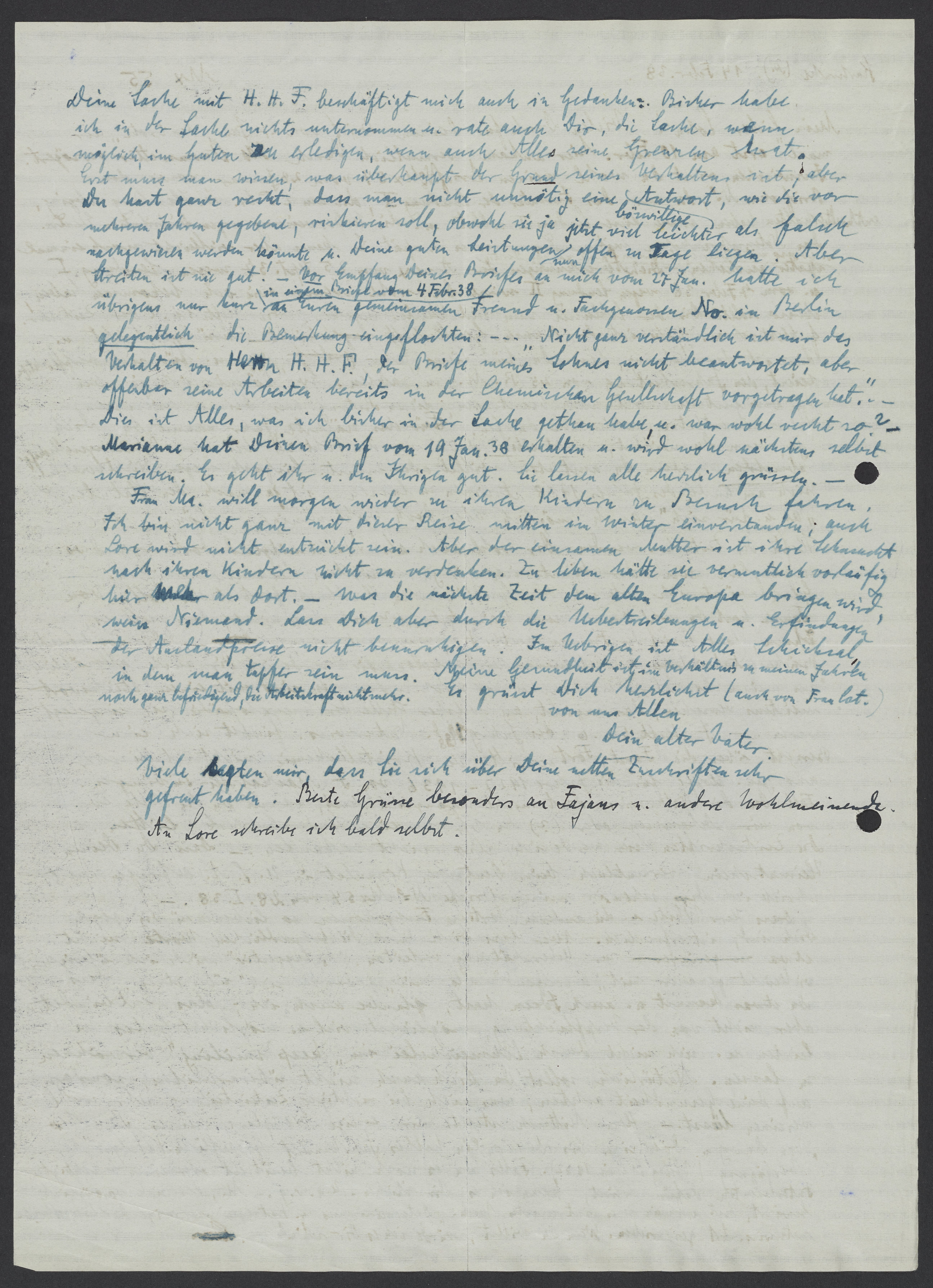 Deine Sache mit H.H.F. beschäftigt mich auch in Gedanken. Bisher habe ich in der Sache nichts unternommen u. rate auch Dir, die Sache, wenn möglich, im Guten zu erledigen, wenn auch Alles seine Grenzen hat. Erst muss man wissen, was überhaupt der Grund seines Verhaltens ist. Du hast recht, dass man nicht unnötig eine böswillige Antwort, wie die vor mehreren Jahren gegebene, riskieren soll, obwohl es ja jetzt viel leichter als falsch nachgewiesen werden könnte u. Deine guten Leistungen nun offen zu Tage liegen. Aber Streiten ist nie gut! Vor Empfang deines Briefes an mich vom 27 Juni hatte ich übrigens nur kurz in einem Brief vom 4. Febr. an Euren gemeinsamen Freund u. Fachgenossen No. in Berlin gelegentlich die Bemerkung eingeflochten: … „Nicht ganz verständlich ist mir das Verhalt von Herrn H.H.F., der Briefe meines Sohnes nicht beantworte, aber offenbar seine Arbeiten bereits in der Chemischen Gesellschaft vorgetragen hat.“ Dies ist alles, was ich bisher in der Sache gethan habe, u. war wohl recht so? Marianne hat Deinen Brief vom 19 Jan. 38 erhalten u. wird wohl nächstens selbst schreiben. Es geht ihr u. den Ihrigen gut. Sie lassen alle herzlich grüssen.