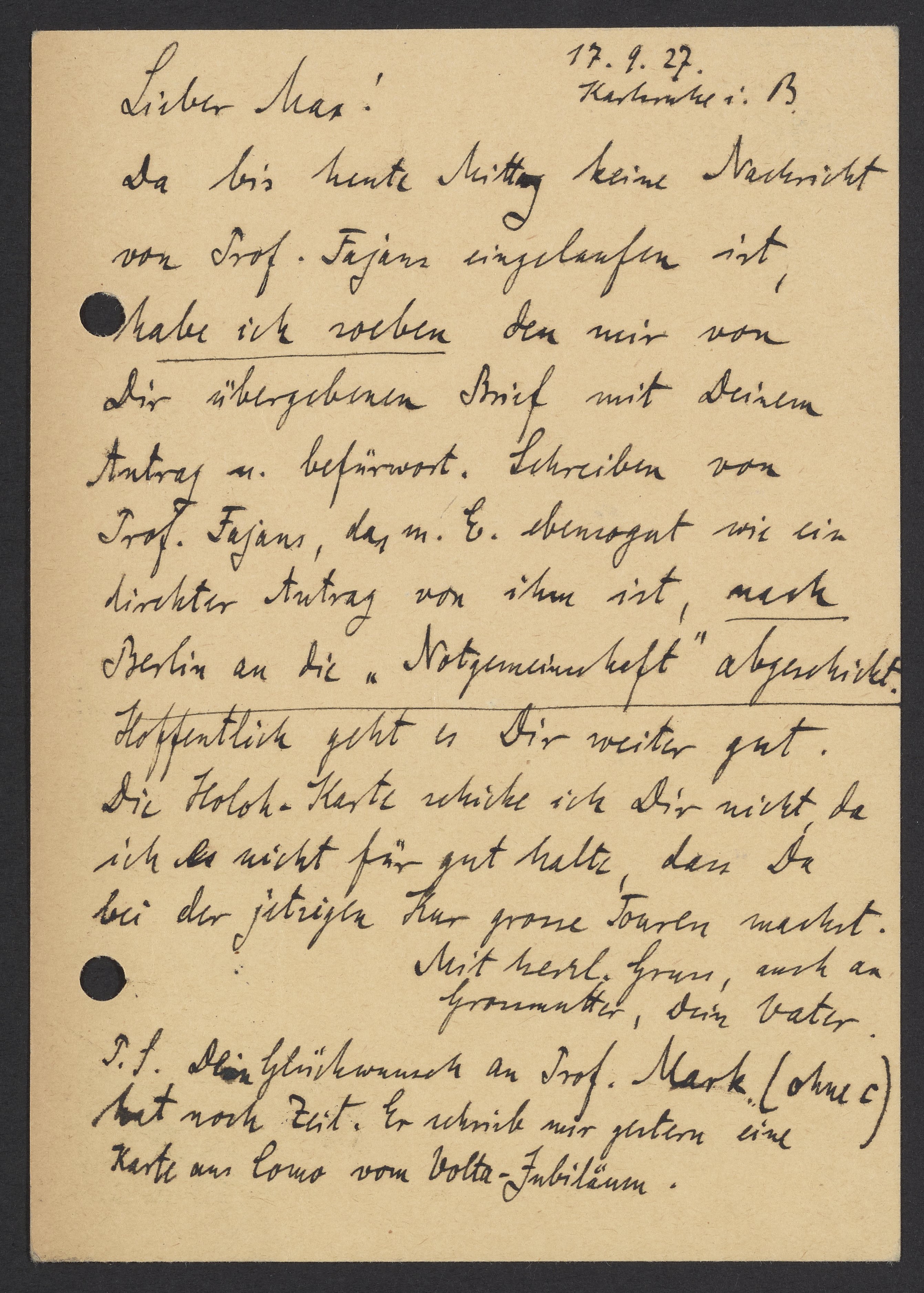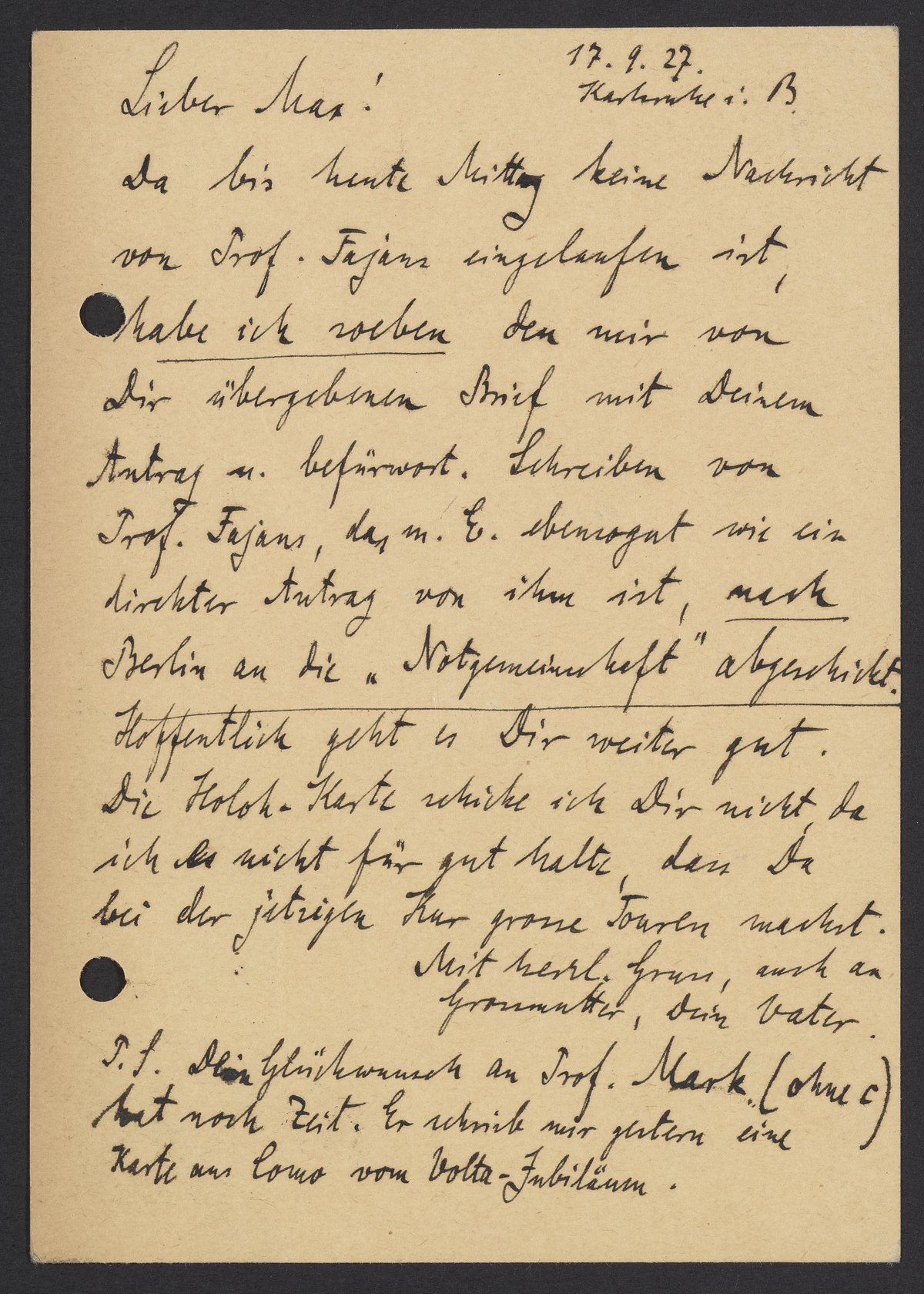 Da bis heute Mittag keine Nachricht von Prof. Fajans eingelaufen ist, habe ich soeben den mir von Dir übergebenen Brief mit Deinem Antrag ü. befürwort. Schreiben von Prof. Fajans, das m. E. ebensogut wie ein direkter Antrag von ihm ist, nach Berlin an die "Notgemeinschaft" abgeschickt. Hoffentlich geht es Dir gut. Die Holok-Karte schicke ich Dir nicht, da ich es nicht für gut halte, das Du bei der jetzigen Kur grosse Touren machst.