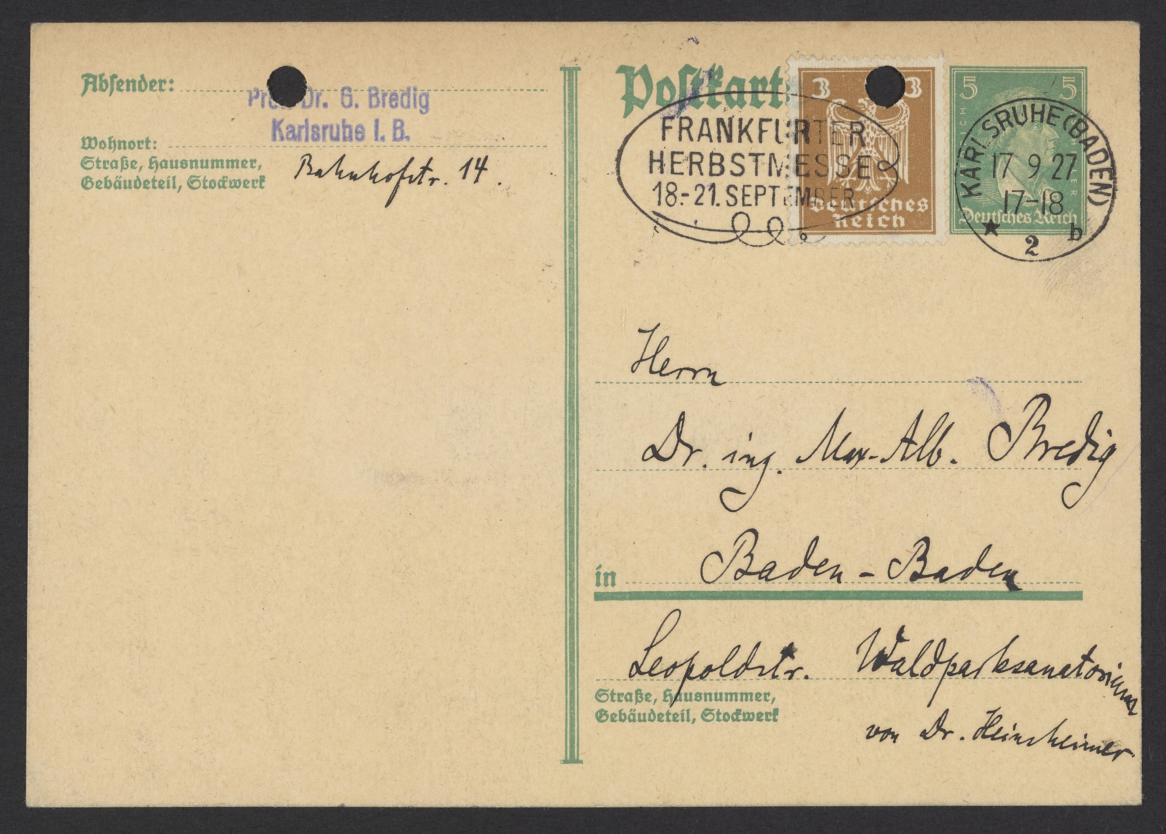 Postcard from Georg Bredig to Max Bredig, September 17, 1927