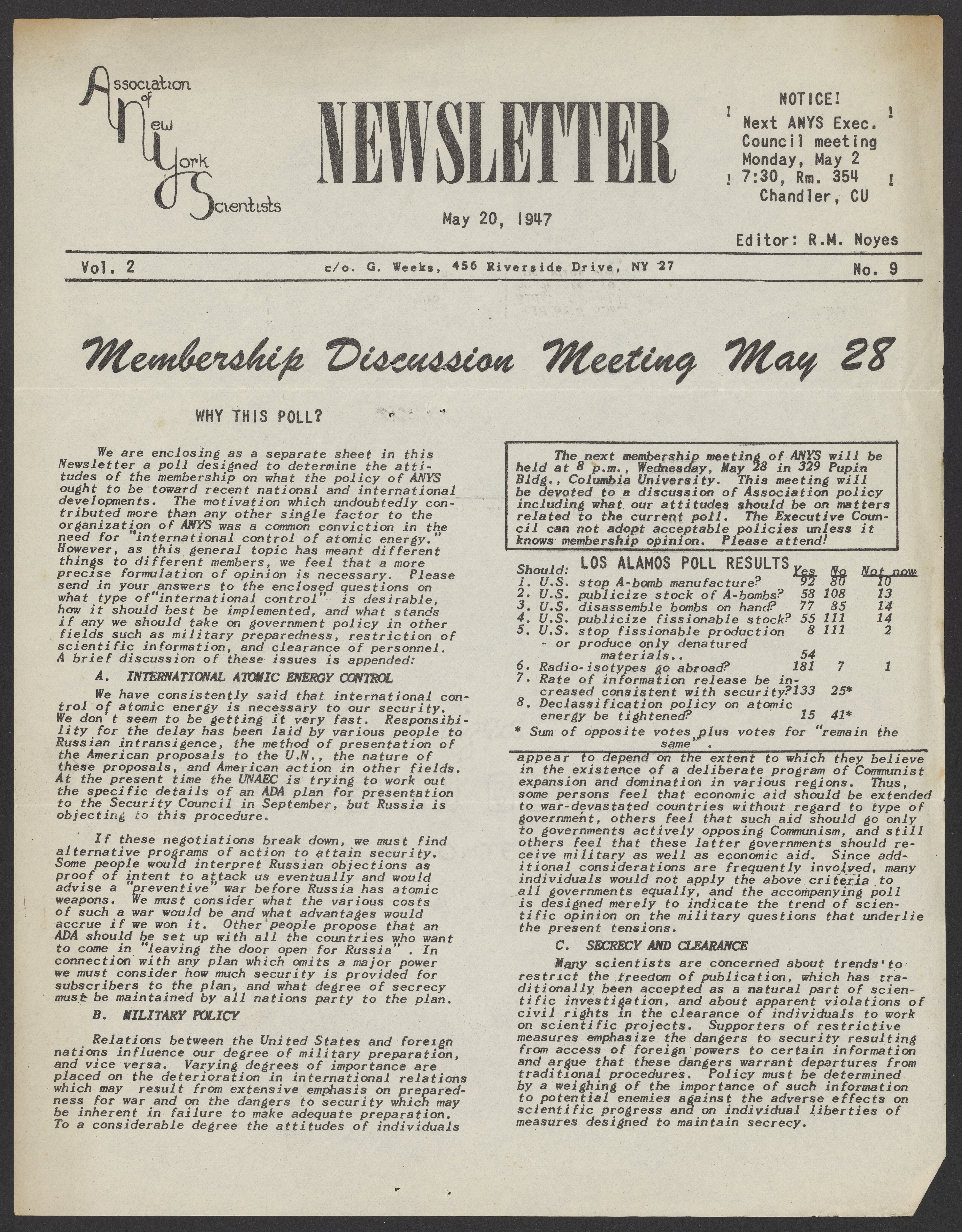 Association of New York Scientists. “Association of New York Scientists Newsletter, May 20, 1947,” May 20, 1947. Papers of Georg and Max Bredig, Box 10, Folder 3. Science History Institute. Philadelphia. https://digital.sciencehistory.org/works/gnjgty2.