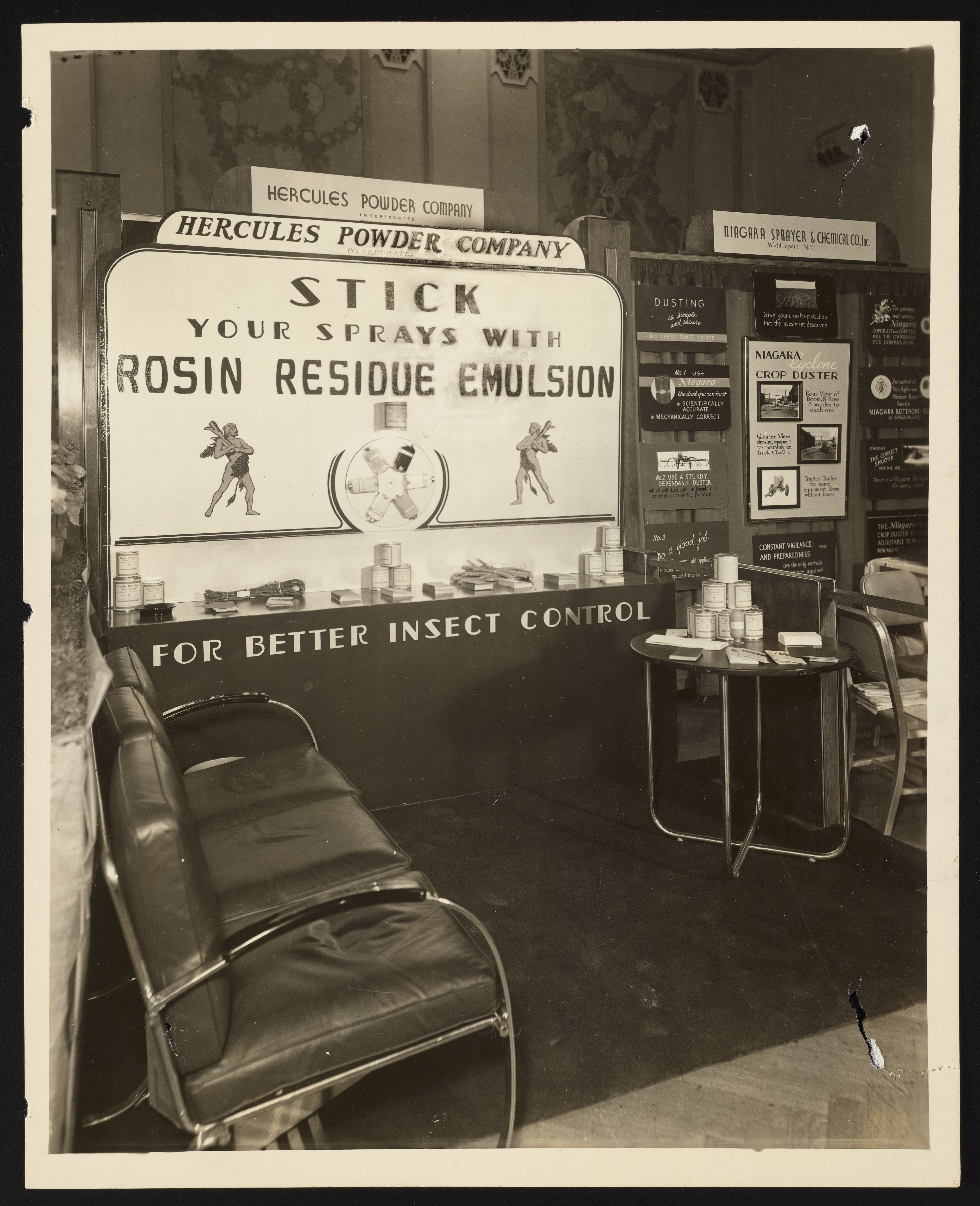 General view of an exhibition display advertising rosin residue emulsion manufactured and sold by the Hercules Powder Company for use in insecticides.