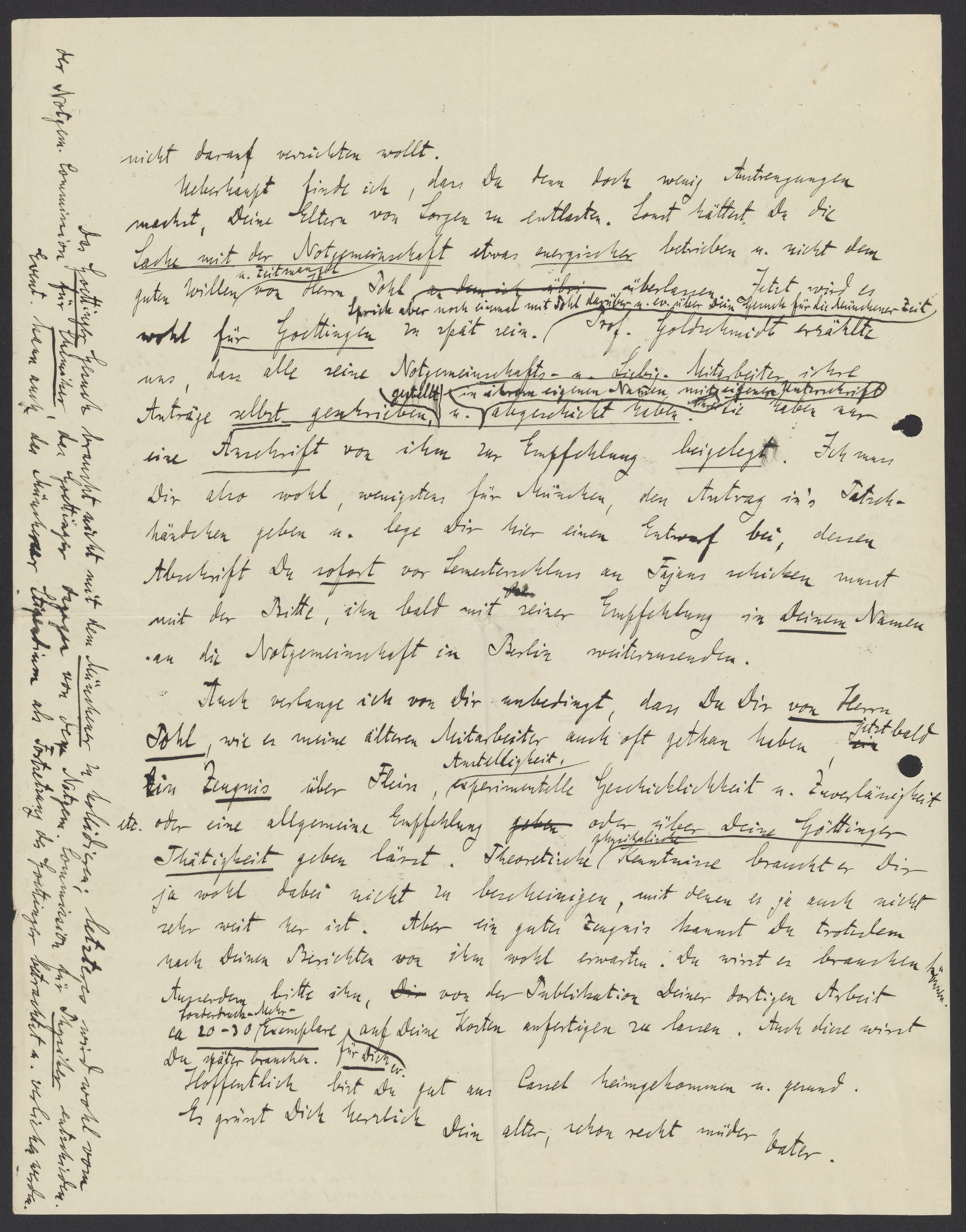 Auch verlange ich Dir unbedingt, dass Du Dir von Herrn Pohl, wie er meine älteren Mitarbeiter auch oft gethan haben, jetzt bald ein Zeugnis über Fleiss, Anstelligkeit, experimentelle Geschicklichkeit, u. Zuverlässigkeit etc. oder eine allgemeine Empfehlung oder über Deine Göttinger Thaetigkeit geben lässt. Theoretische physikalische Kenntnisse braucht er Dir ja wohl dabei nicht zu bescheinigen, mit denen er ja auch sehr weit her ist. Aber ein gutes Zeugnis kannst Du trotzdem nach Deinen Berichten von ihm wohl erwarten. Du wirst es brauchen können. Ausserdem bitte ihn, von der Publikation Deiner dortigen Arbeit ca ^Sonderdrucke-Mehr-^ 20-30 Exemplare ^für Dich^ auf Deine Kosten anfertigen zu lassen. Auch diese wirst Du später brauchen.
