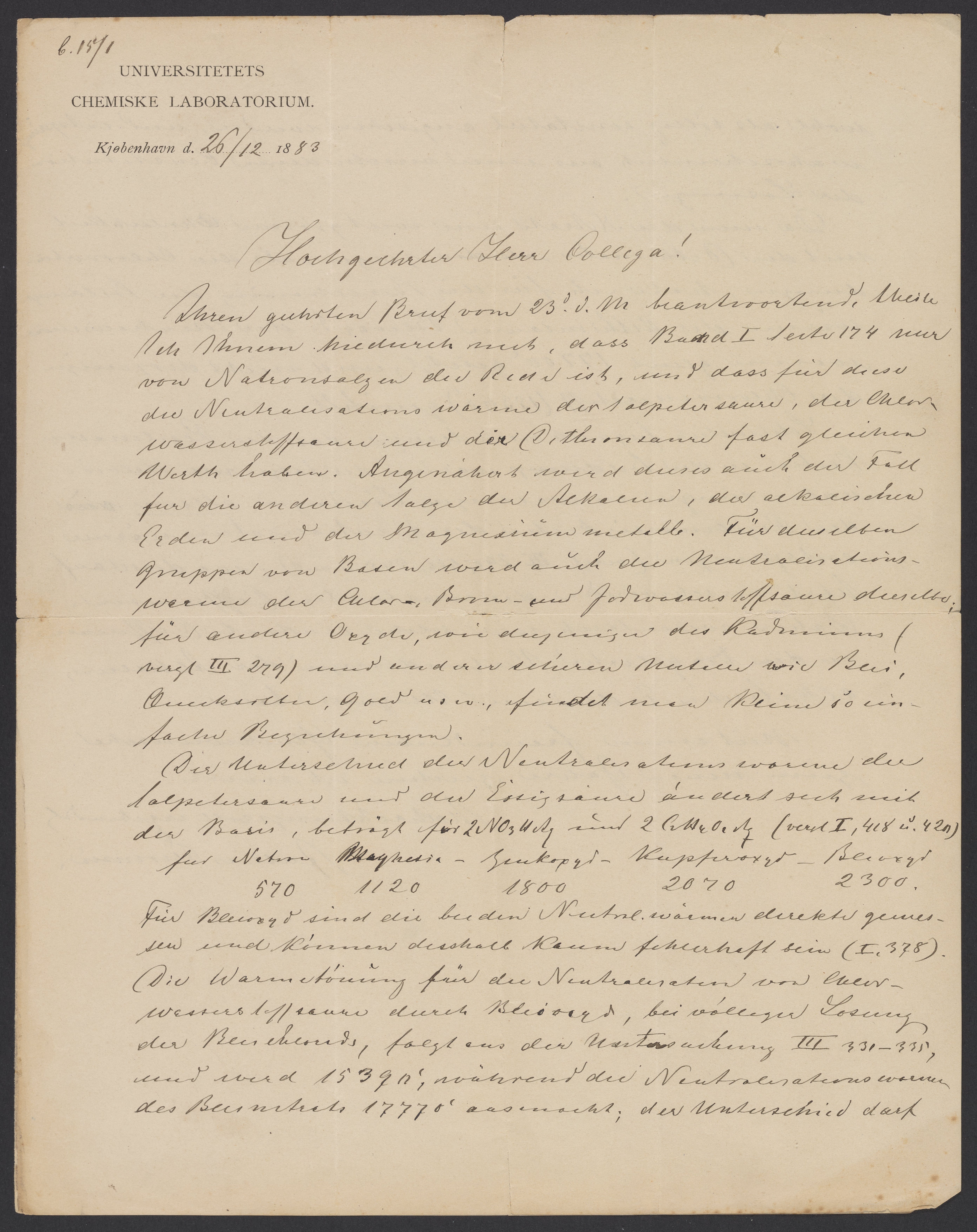 Thomsen, Julius. “Letter from Julius Thomsen to Georg Bredig, December 1883,” May 2, 1917. Papers of Georg and Max Bredig, Box 2, Folder 27. Science History Institute. Philadelphia. https://digital.sciencehistory.org/works/gsawqq7.