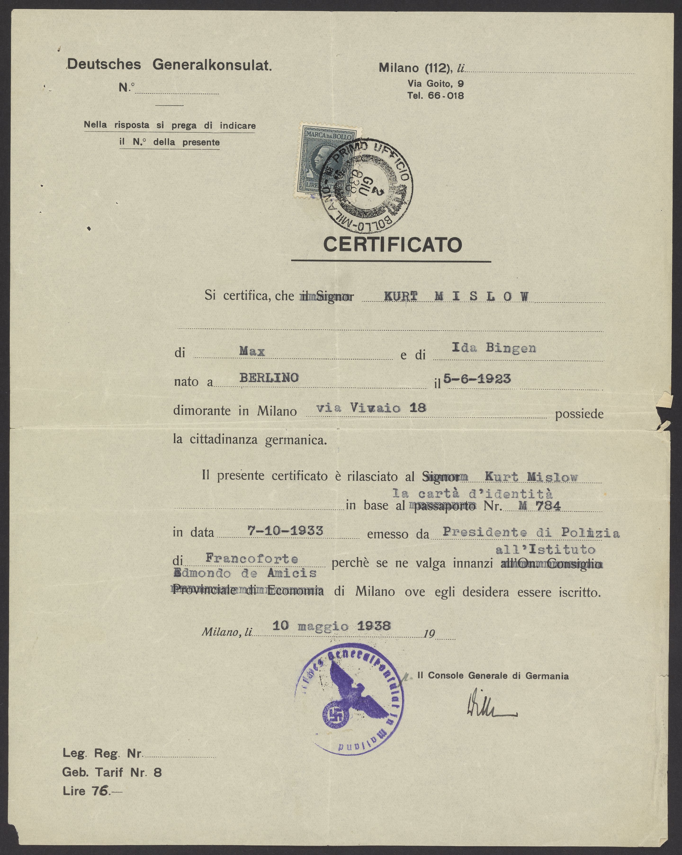 Kurt M. Mislow's certificate of identity, May 10, 1938