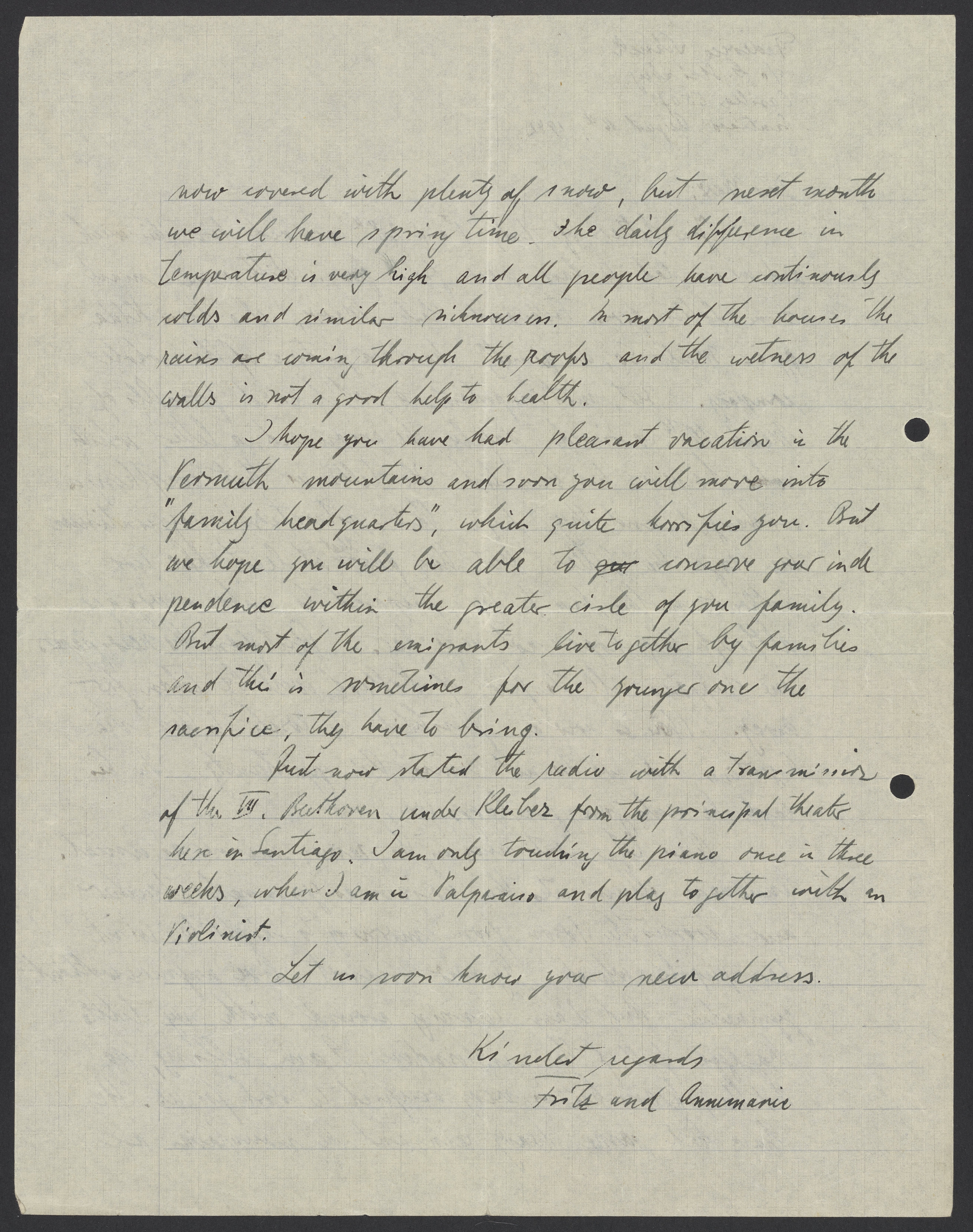 Small JPG1200 x 1519px — 370 KBLarge JPG2880 x 3645px — 2.3 MBFull-sized JPG5238 x 6630px — 6.8 MBOriginal fileTIFF — 5238 x 6630px — 99 MBFederico and Annemarie Schnell write to their friend Max Bredig (1902-1977) with updates on their lives in Santiago, Chile. Annemarie is busy as a gymnastics teacher, and Frederico sells merchandise and plays the piano occasionally in Valparaiso. They discuss the correspondence they've received from friends abroad and offer consolation to Max upon his impending move-in to live with his family.