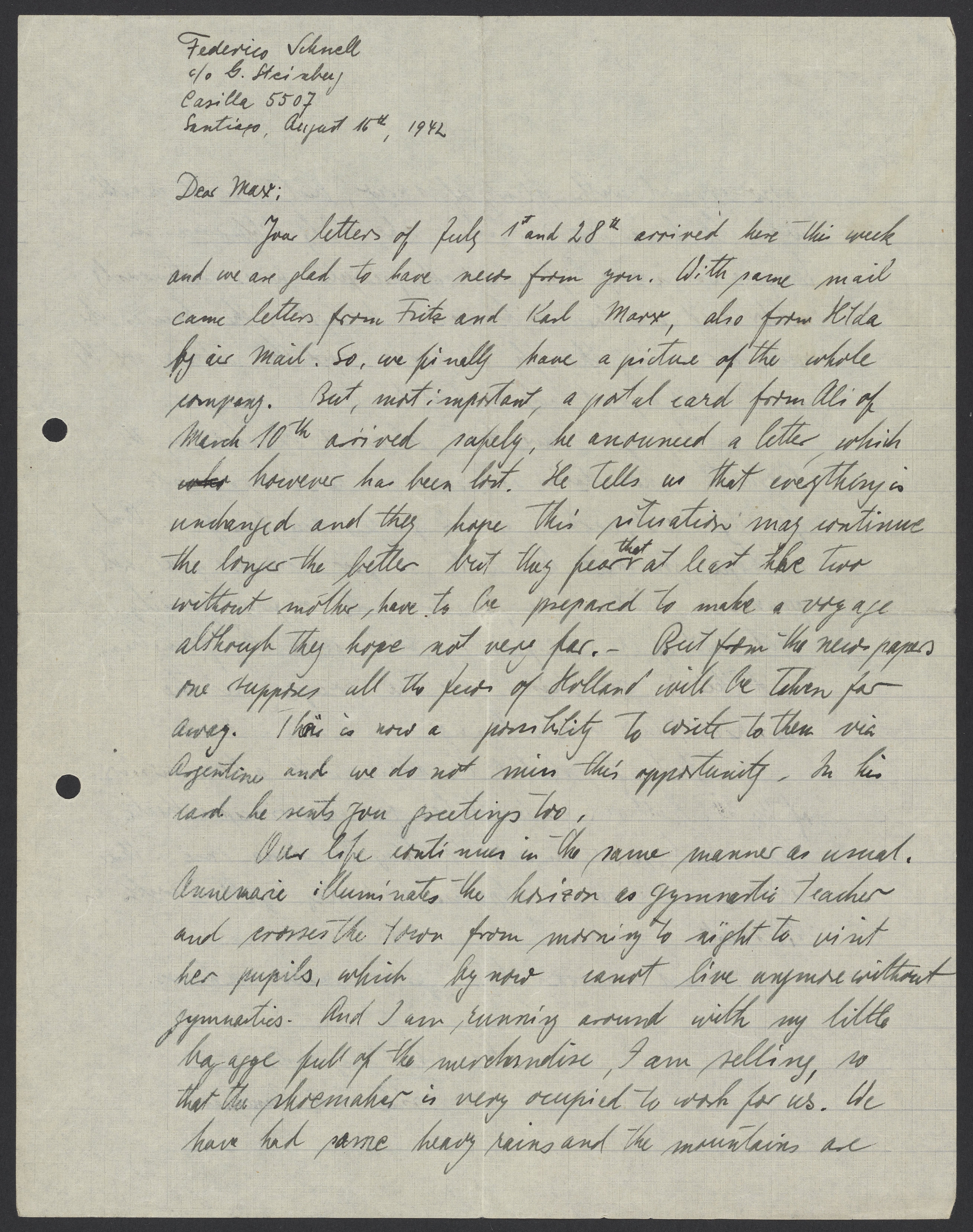 Your letters of July 1st and 28th arrives here this week and we are glad to have news from you. With same mail came letters from Frita and Karl Marx, also from Kilda by air mail. So we finally have a picture of the whole company. But, most important, a postal card from Ali of March 10th arrived safely, he announced a letter, while however has been lost. He tells us that everything is unchanged and they hope this situation may continue the longer the better but they fear that at least the two without mother, have to be prepared to make a voyage although they hope not very far. But from the news papers one supposes all the Jews of Holland will be taken far away. This is now a possibility to write to them via Argentina and we do not miss this opportunity. In his card he sends you greetings too.