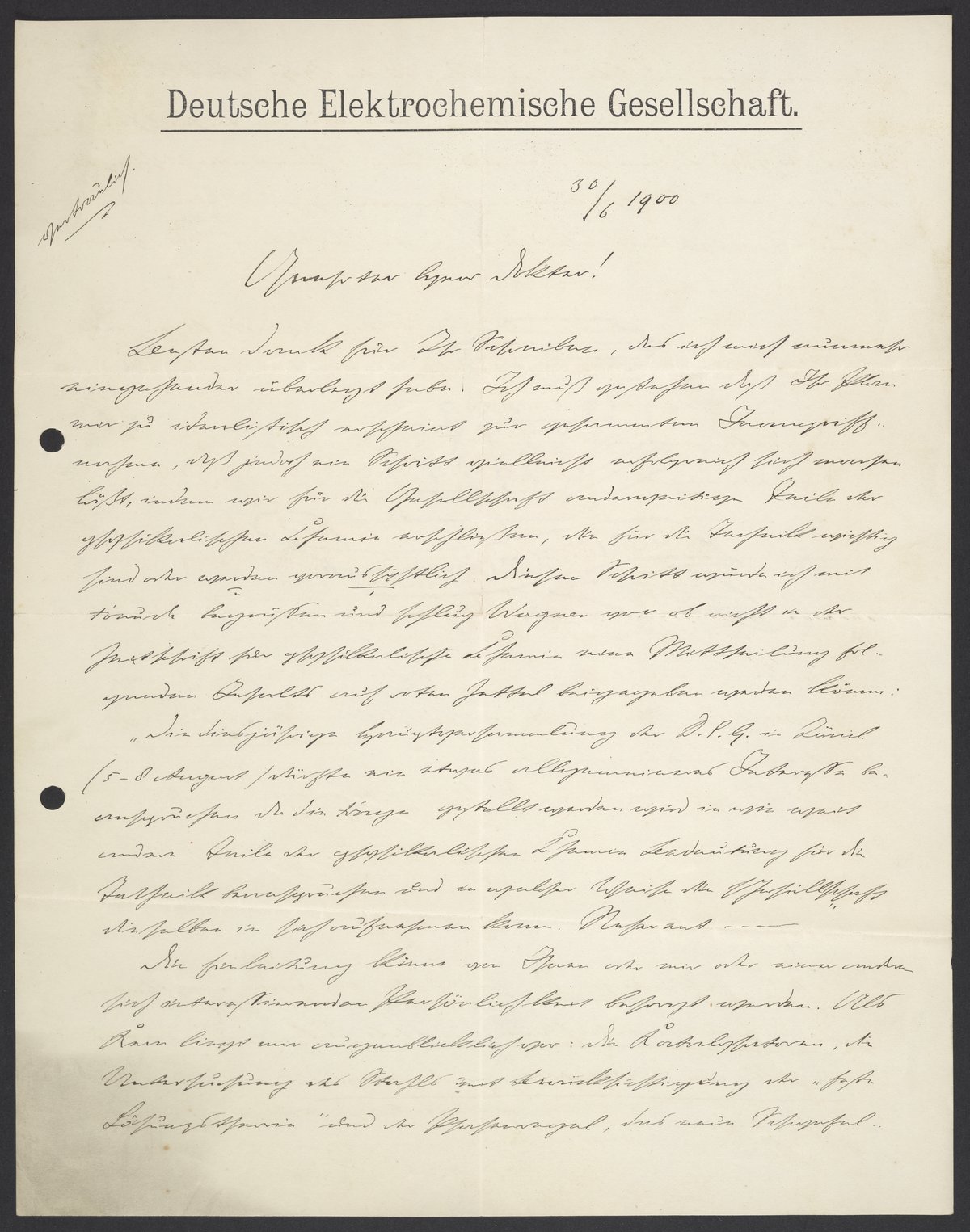 Besten Dank für Ihr Schreiben, das ich mich nunmehr eingehender überlegt habe. Ich muß gestehen daß Ihr Plan mir zu idealistisch erscheint zur gesamten Inangriffnahme, daß jedoch ein Schritt vielleicht erfolgreich sich machen läßt, indem wir für die Gesellschaft anderweitige Teile der physikalischen Chemie erschließen, die für die Technik wichtig sind oder werden voraussichtlich. Diesen Schritt würde ich mit Freude begrüßen und schlug [Ernst Heinz] Wagner vor ob nicht in der Zeitschrift für physikalische Chemie eine Mittheilung folgenden Inhalts auf rotem Zettel beigegeben werden könne: