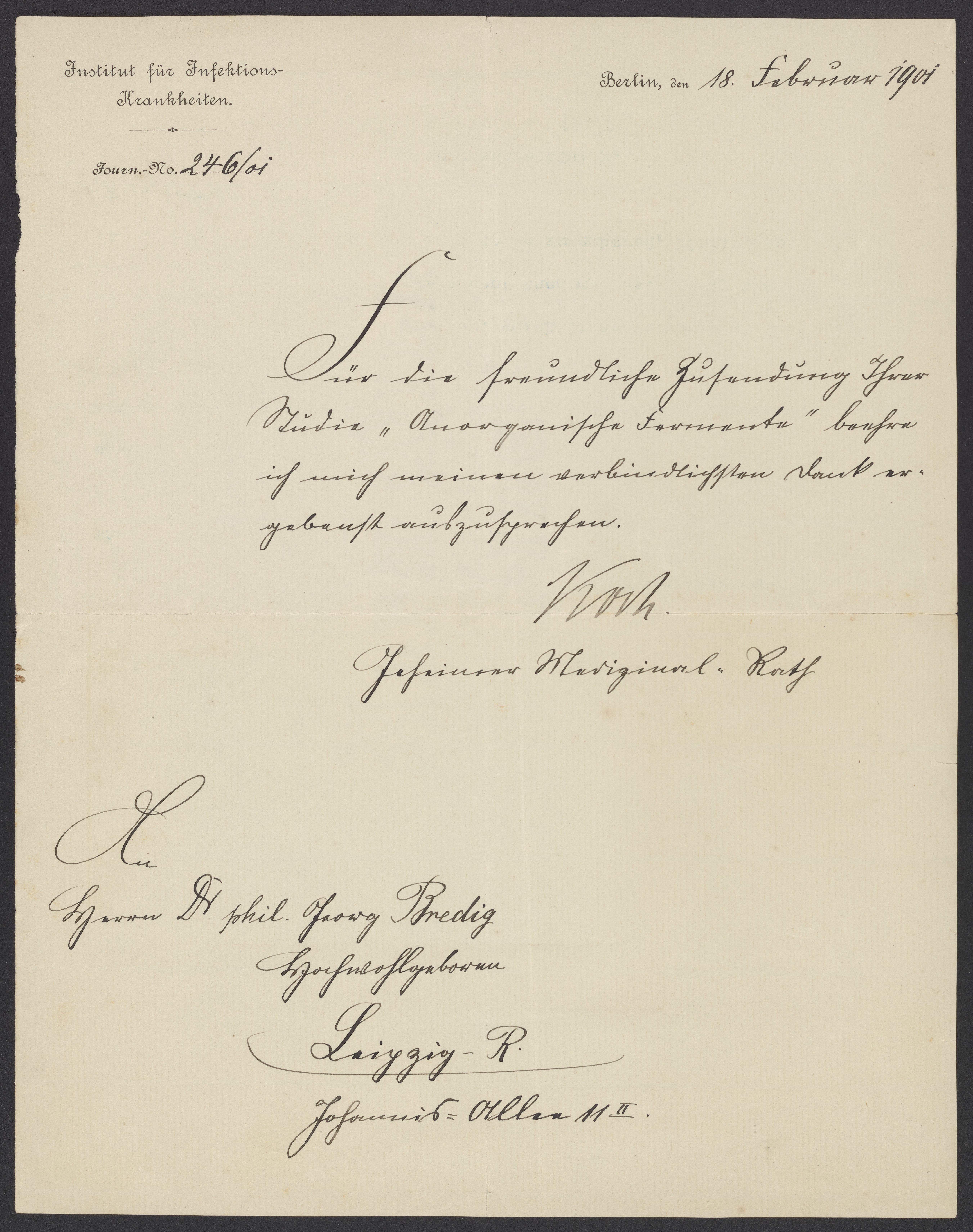 Koch, Robert. “Letter from Robert Koch to Georg Bredig,” February 18, 1901. Papers of Georg and Max Bredig, Box 2, Folder 7. Science History Institute. Philadelphia. https://digital.sciencehistory.org/works/gsy0vmn.