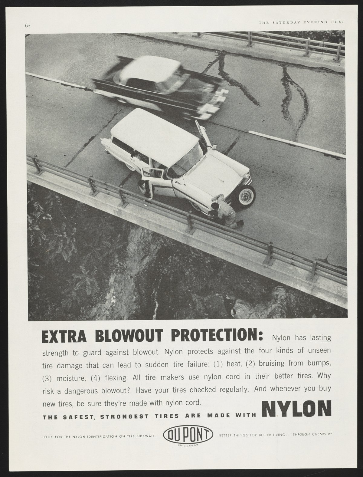 Black and white print magazine advertisement for DuPont's nylon cord tires. Image depicts a man and a woman dealing with car troubles on a bridge.