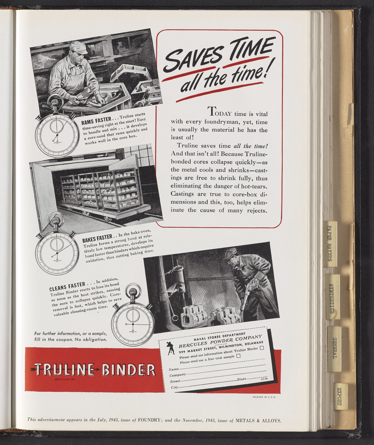 Hercules Incorporated. “Saves Time All the Time!” 1943 Hercules Advertisements, 1943. Records of Hercules Incorporated, Volume 1943. Science History Institute. Philadelphia. https://digital.sciencehistory.org/works/gt54kn60h.