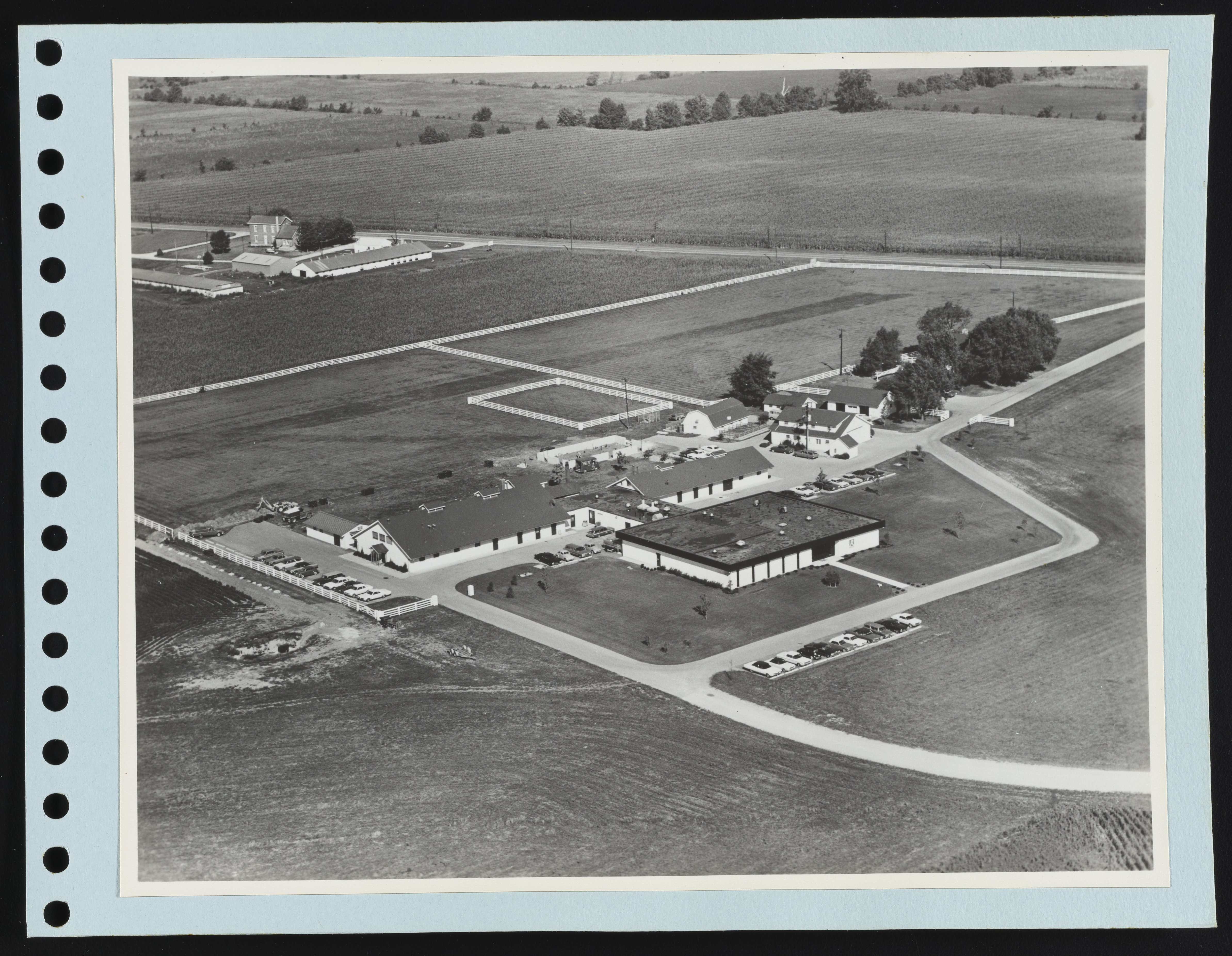 Aerial view of the Warren-Teed Pharmaceuticals, Inc. research center facility located in Dublin, Ohio. Rohm and Haas, an international chemical company headquartered in Philadelphia, Pennsylvania, acquired Warren-Teed in 1964 as part of an effort to diversify the company's product offerings to include fibers and health products. However, due to a lack of profit, these product lines and facilities were sold off by 1977.