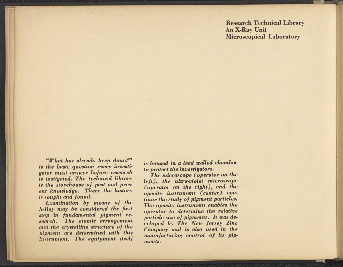 Small JPG1200 x 898px — 148 KBLarge JPG2880 x 2155px — 976 KBFull-sized JPG4228 x 3164px — 2.0 MBOriginal fileTIFF — 4228 x 3164px — 38.3 MBA publication showcasing the laboratories, apparatus, machinery, and personnel of the New Jersey Zinc Company. Intended to present the company's research facilities in Palmerton, Pennsylvania used for zinc pigment production. Includes twenty-two black and white photographs. The New Jersey Zinc Company (now the Horsehead Holding Corporation) was the largest producer of Zinc in the United States from 1897 to 1966. The work is digitized in its entirety.