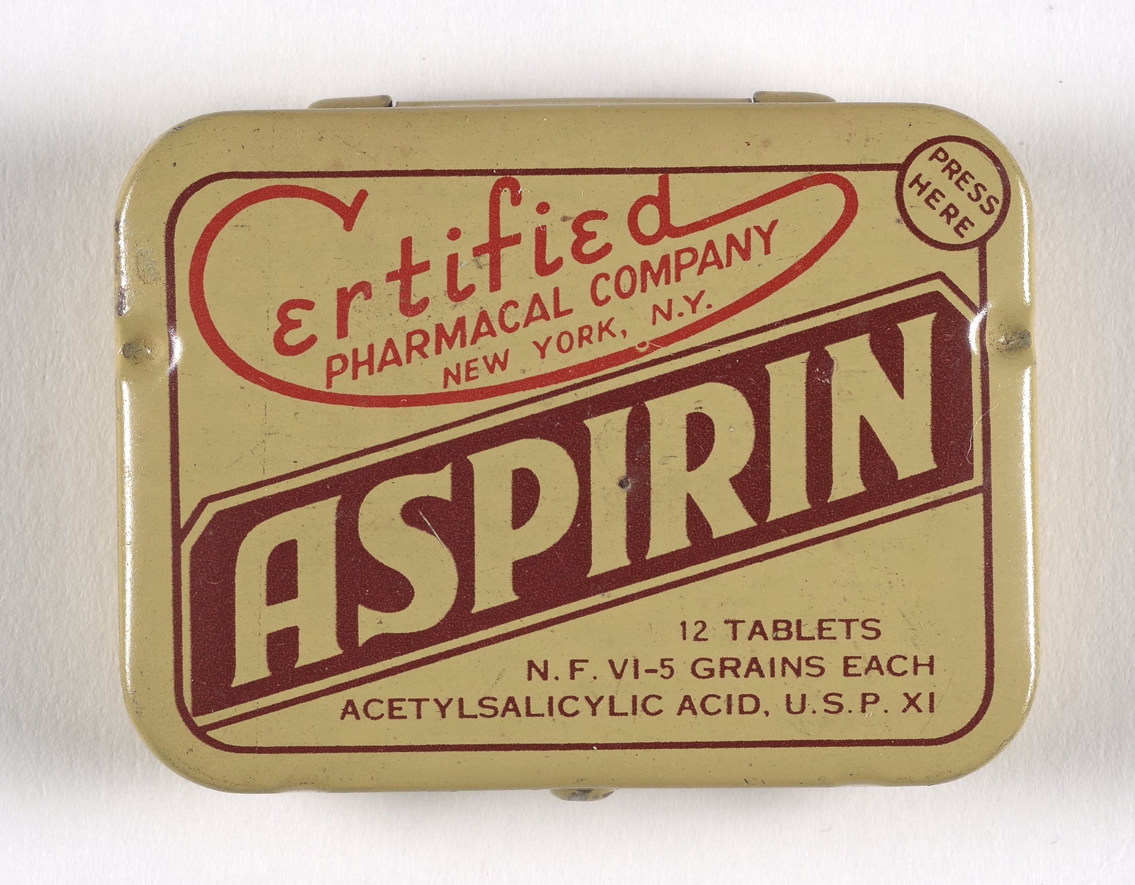 Science History Institute. Certified Pharmacal Company Aspirin Pillbox, 12 Tablet Size. Photograph, 2017. Science History Institute. Philadelphia. https://digital.sciencehistory.org/works/gx41mj36p.