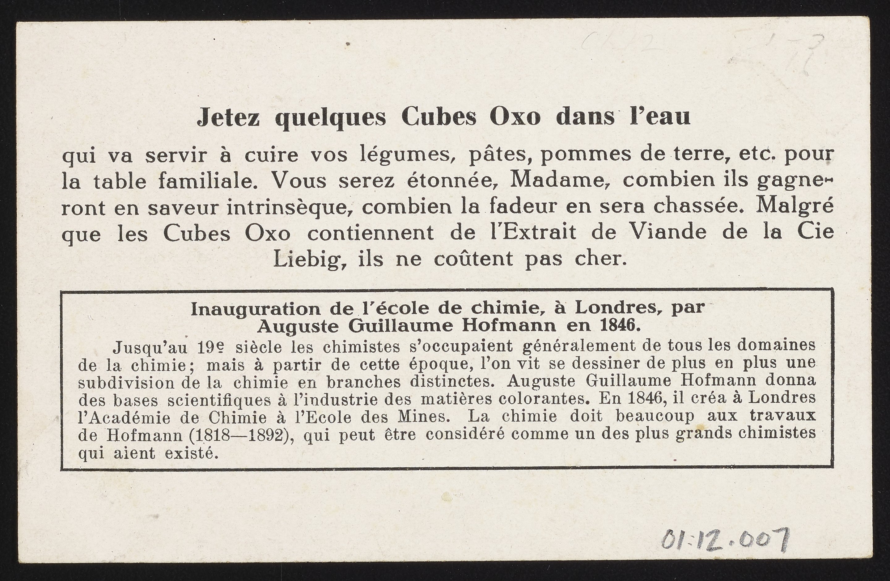 Trade card for Cubes de Bouillon Oxo with August Wilhelm von Hofmann