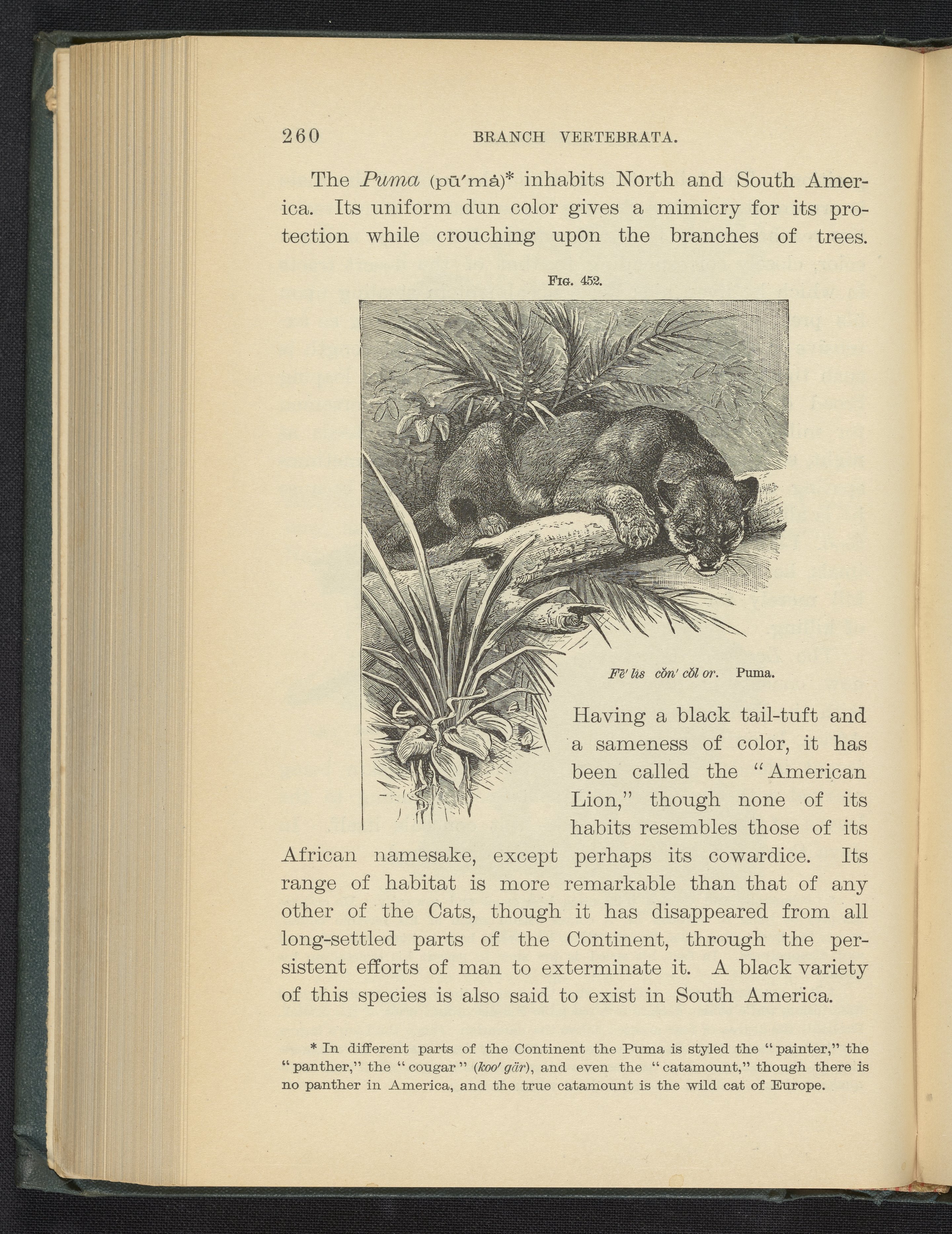 Figure 452 of the 1887 volume Popular Zoology depicting a puma in a natural habitat.