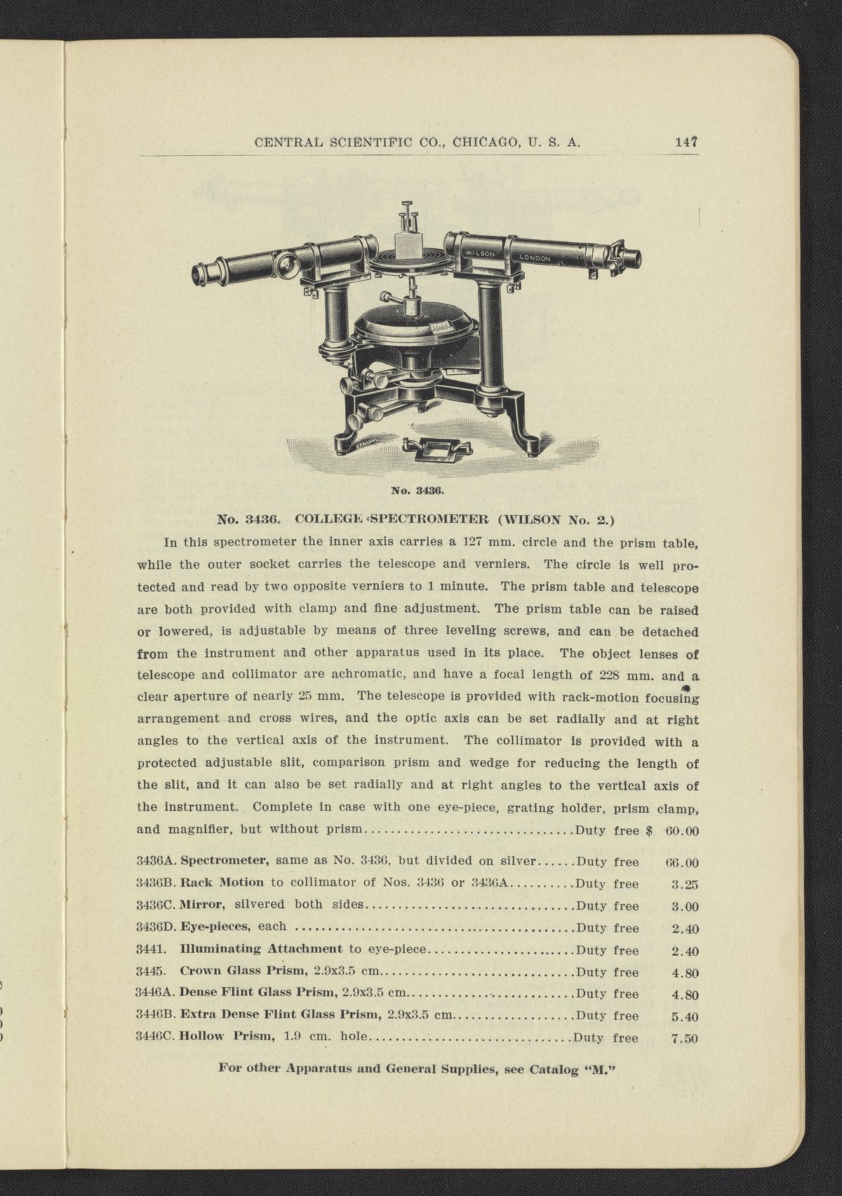 Central Scientific Company. “College Spectrometer (Wilson No. 2).” Physical Apparatus for Universities and Colleges Manufactured and Imported by Central Scientific Co. Chicago, Illinois: Central Scientific Company, 1912. Q185.7 .C46 1912. Science History Institute. Philadelphia. https://digital.sciencehistory.org/works/h0cuvvb.