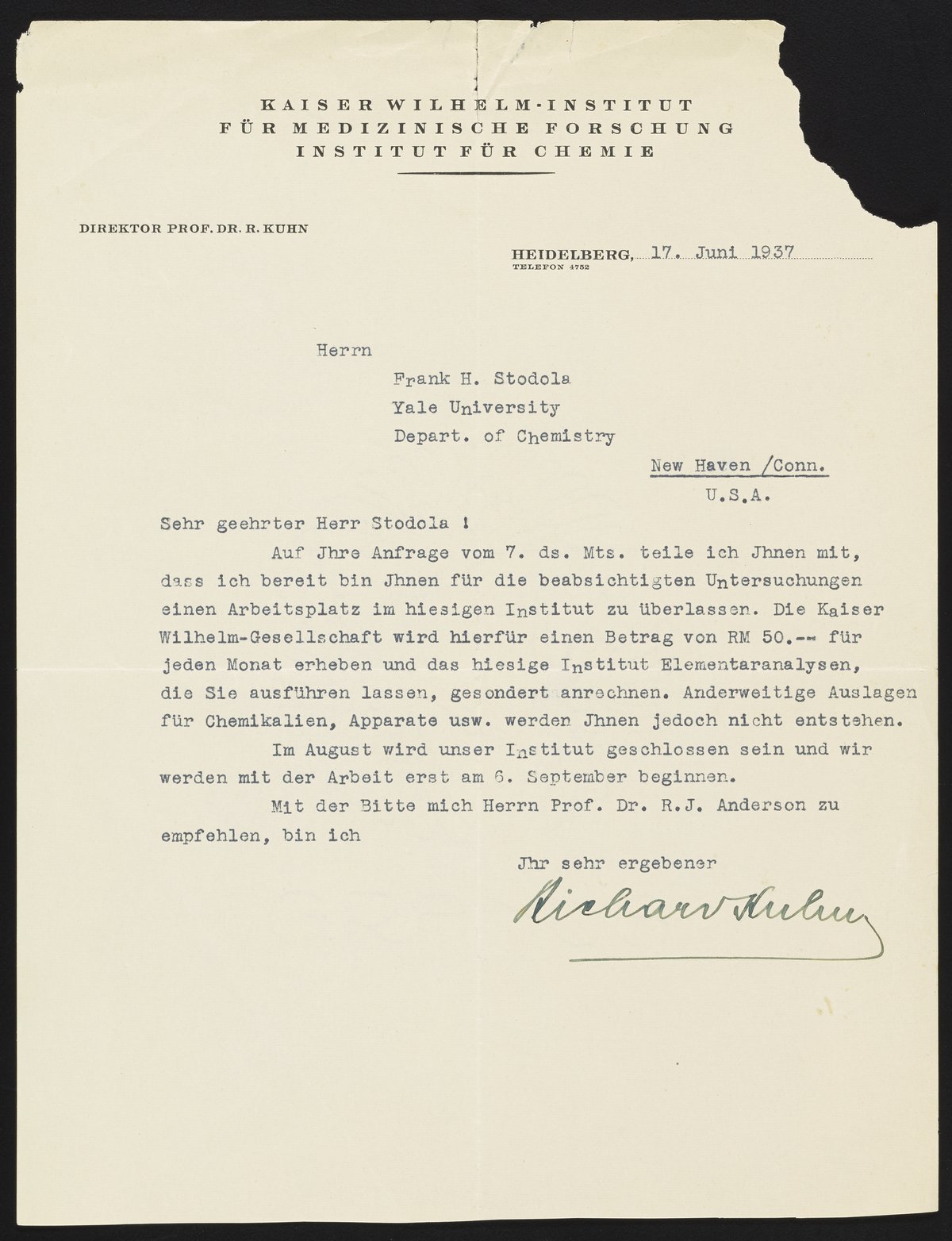 Kuhn, Richard. “Letter from Richard Kuhn to Frank Stodola,” June 17, 1937. Frank H. Stodola Nobel Laureate Letter Collection, Box 1. Science History Institute. Philadelphia. https://digital.sciencehistory.org/works/h128nd72w.