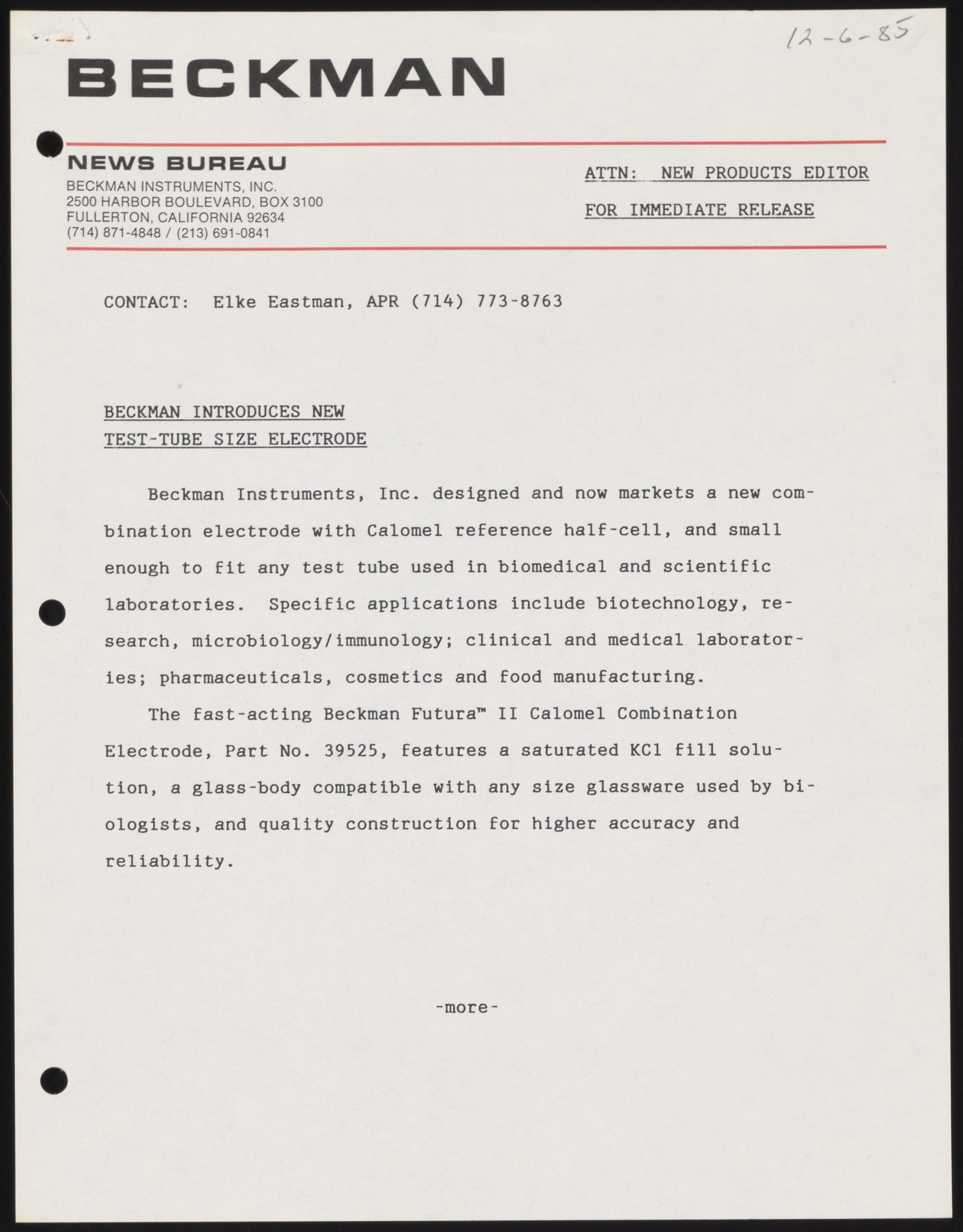 Eastman, Elke. “Beckman Introduces New Test-Tube Size Electrodes,” December 6, 1985. Beckman Historical Collection, Box 58, Folder 70. Science History Institute. Philadelphia. https://digital.sciencehistory.org/works/h128nf07s.