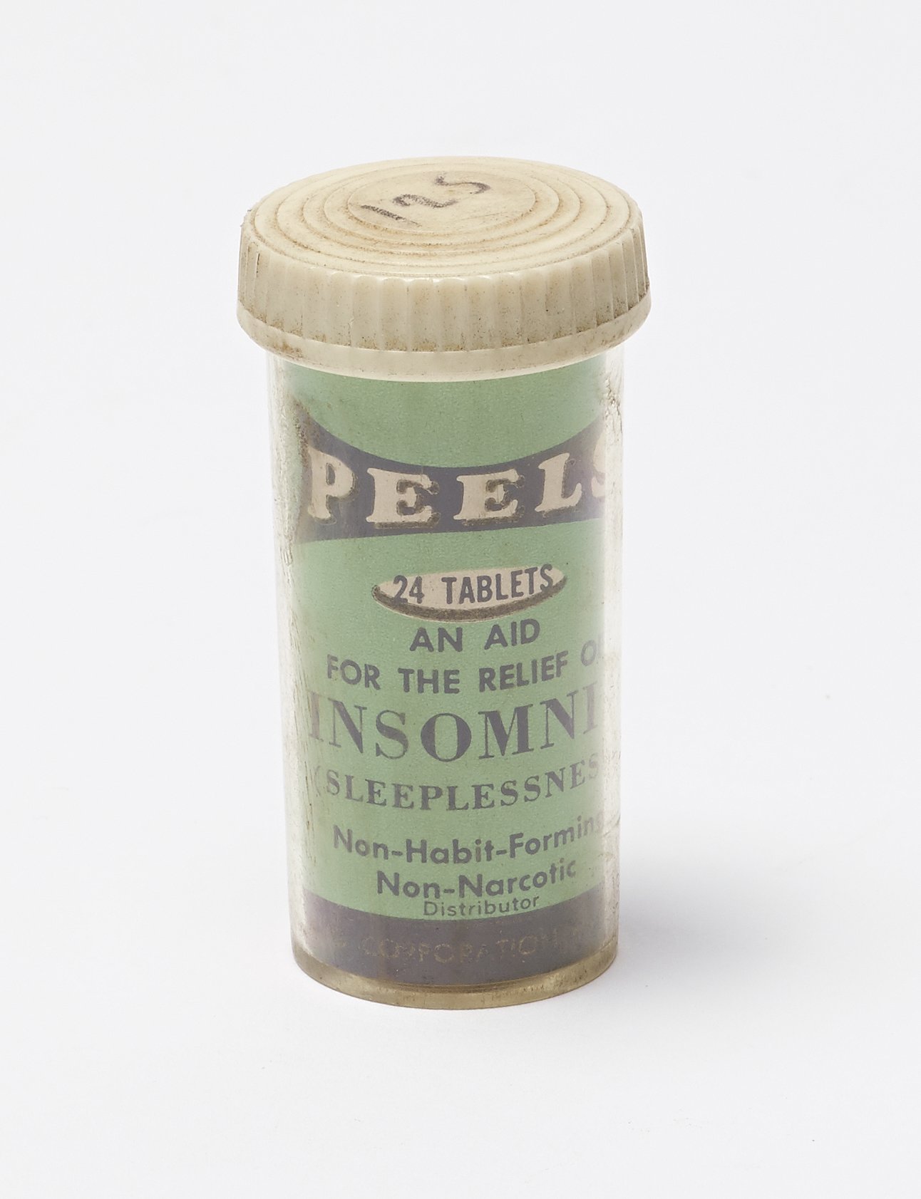 Science History Institute. Bottle for Peels Insomnia Relief Pills. Photograph, 2017. Science History Institute. Philadelphia. https://digital.sciencehistory.org/works/h128nf082.