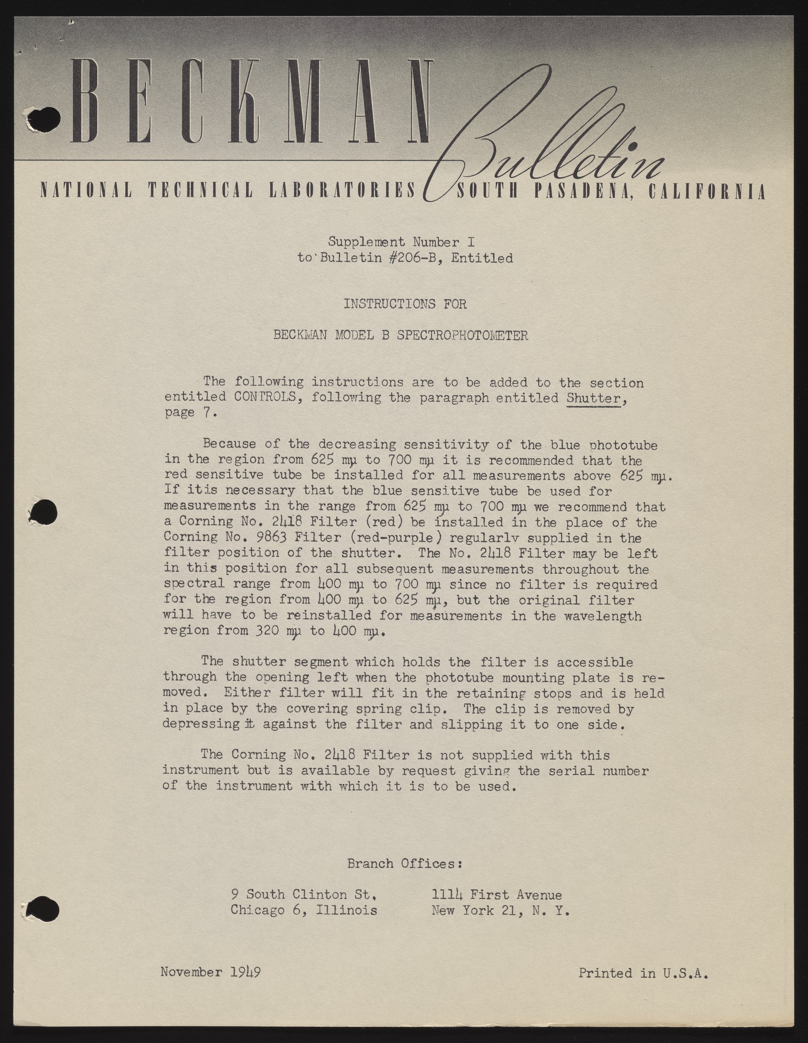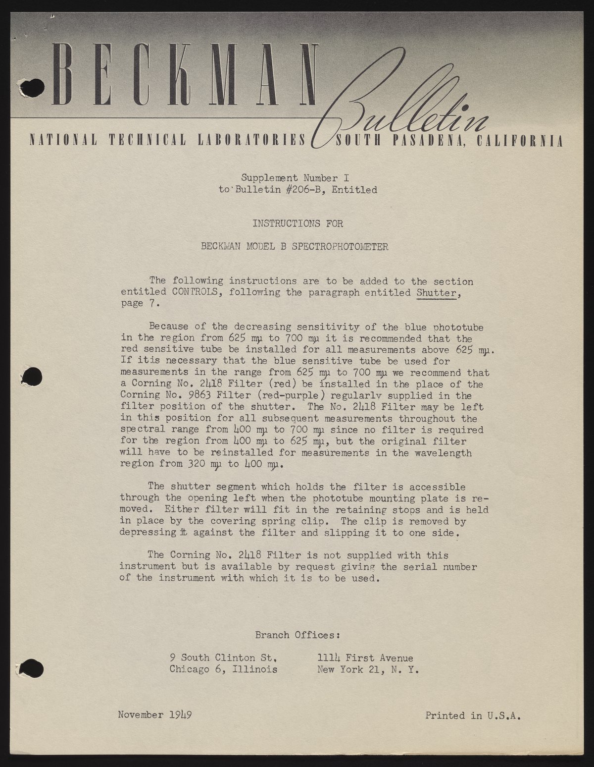 Beckman Instruments, Inc. “Supplement Number 1 to Bulletin #206-B,” November 1949. Beckman Historical Collection, Box 104, Folder 146. Science History Institute. Philadelphia. https://digital.sciencehistory.org/works/h128nf12n.