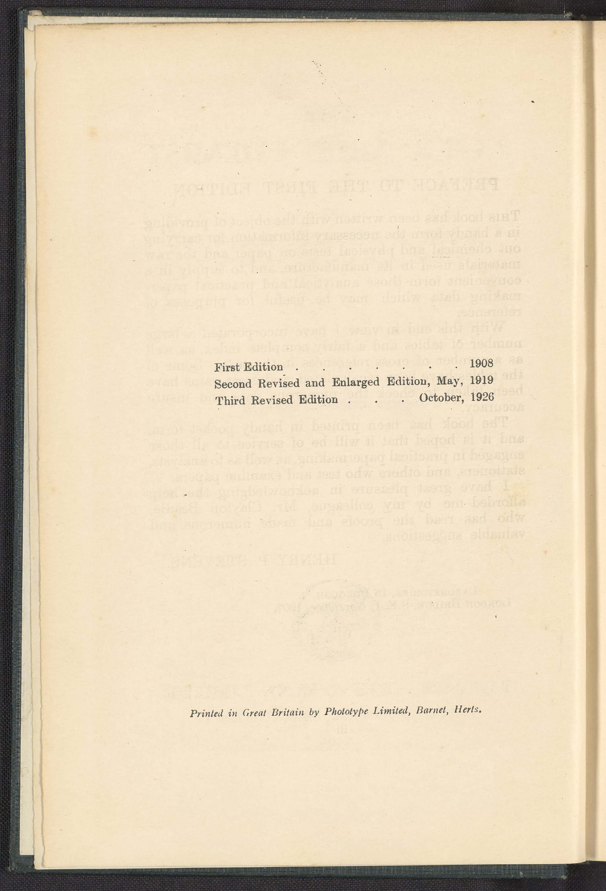 Small JPG1200 x 1676px — 476 KBFull-sized JPG2243 x 3132px — 1.6 MBOriginal fileTIFF — 2243 x 3132px — 20.2 MBThird revised edition of a volume providing an overview of the physicochemical qualities of raw materials used in paper manufacture, pertinent papermaking data, and instructions for conducting various physical and chemical tests on paper. Contains black and white drawings, diagrams, and tables. Author Henry Potter Stevens (1875-1965) was an English chemist, etcher, and watercolorist. Stevens graduated from Oxford in 1896 with a degree in chemistry and became a prominent chemist in the rubber industry.